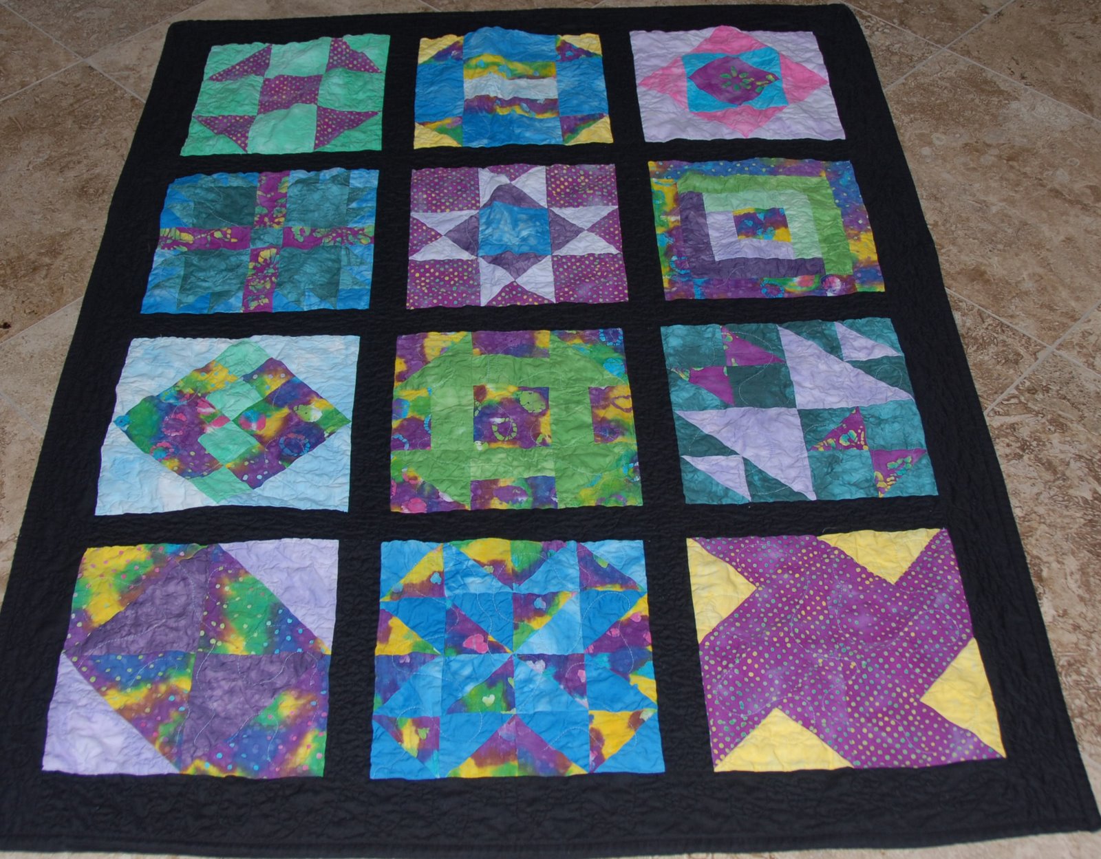 Class Sampler quilt for a class that I taught for beginning quilters. The individual block samples that I used in class were with very traditional reproduction fabrics to show the variety of outcomes for the same patterns.