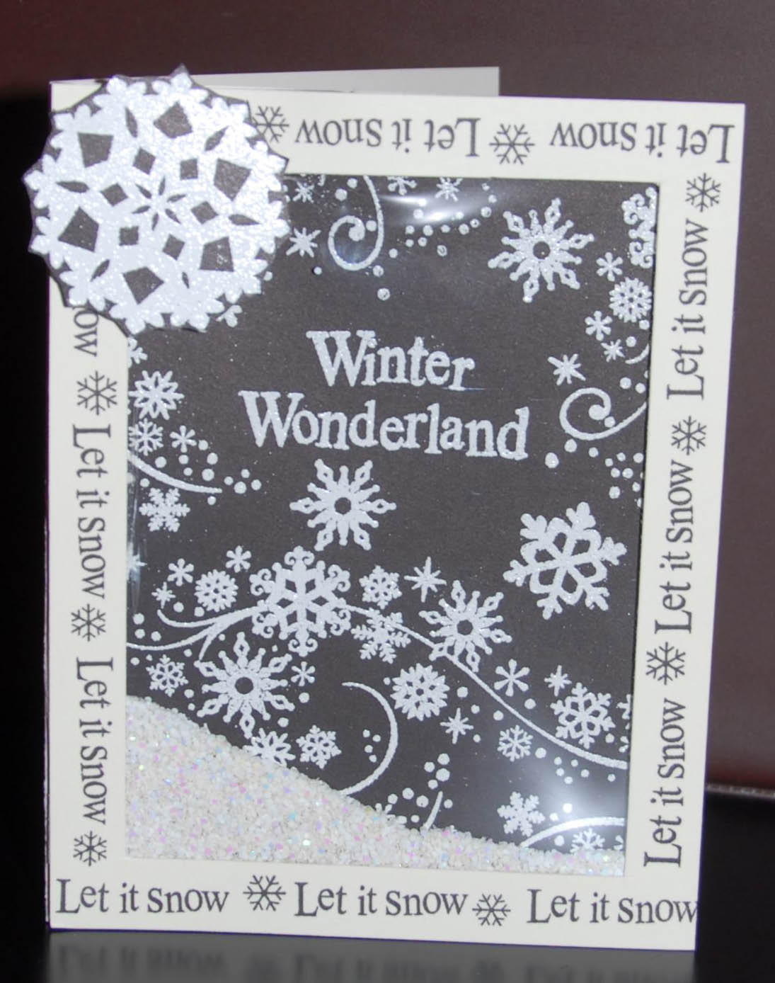 This fun card is a standard size card base with a Colonial White frame made with a transparency sheet sandwiched with 3 D Foam. I stamped images from CTMH’s Snow Flurries set using Versamark ink on black cardstock and then embossed using White Daisy powder. Inside the sandwich, I poured some ancient white chunky glitter.