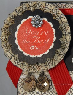 This one was layered with some of the new gem embellishments that come in the Heirloom Assortment (CTMH Z1635) and a 2″ black card stock scallop with a stamped sentiment on top.