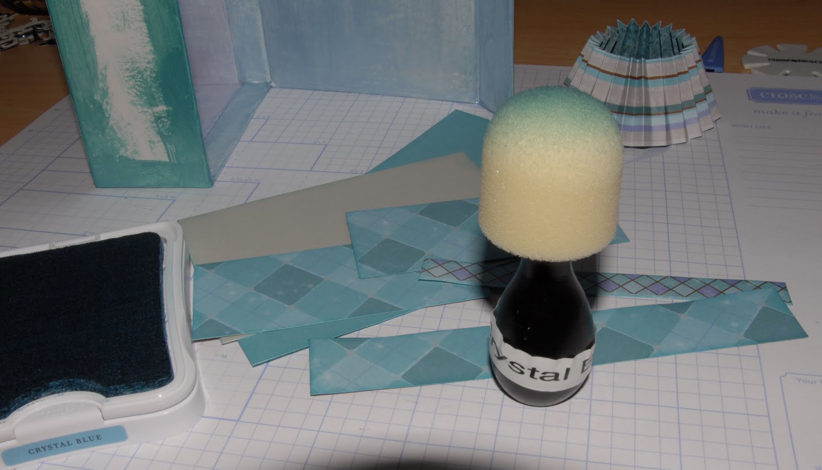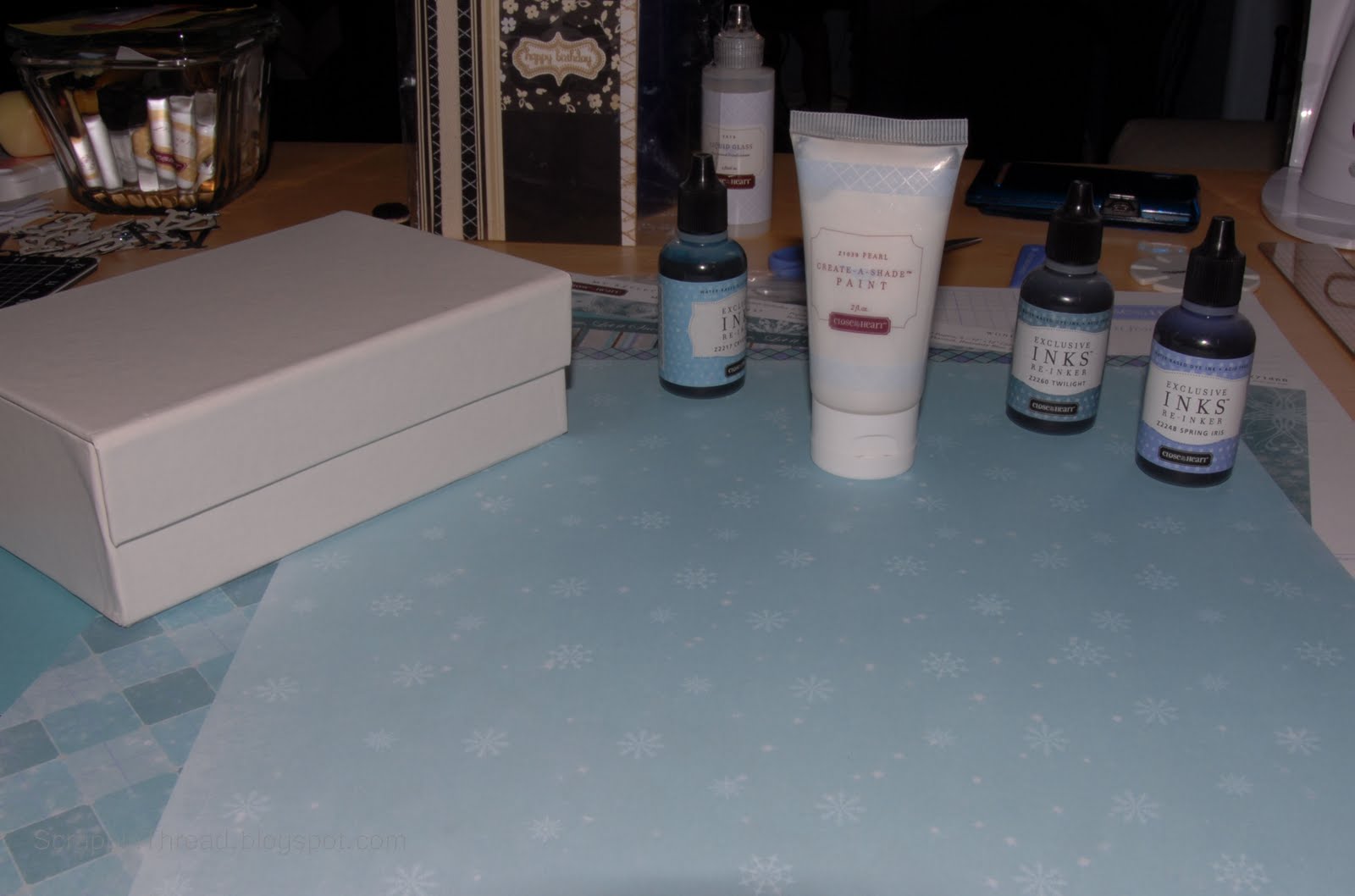 All the pieces of paper are cut and will be sponge distressed using Crystal Blue ink.  I label whatever I can, so that I can find what I need fairly quickly.  The card box is in the background after I painted it with the newly mixed pearl paint colors.