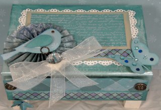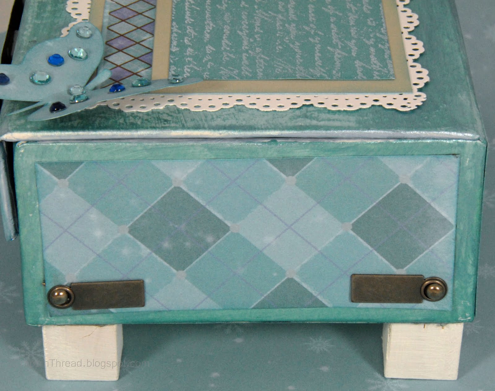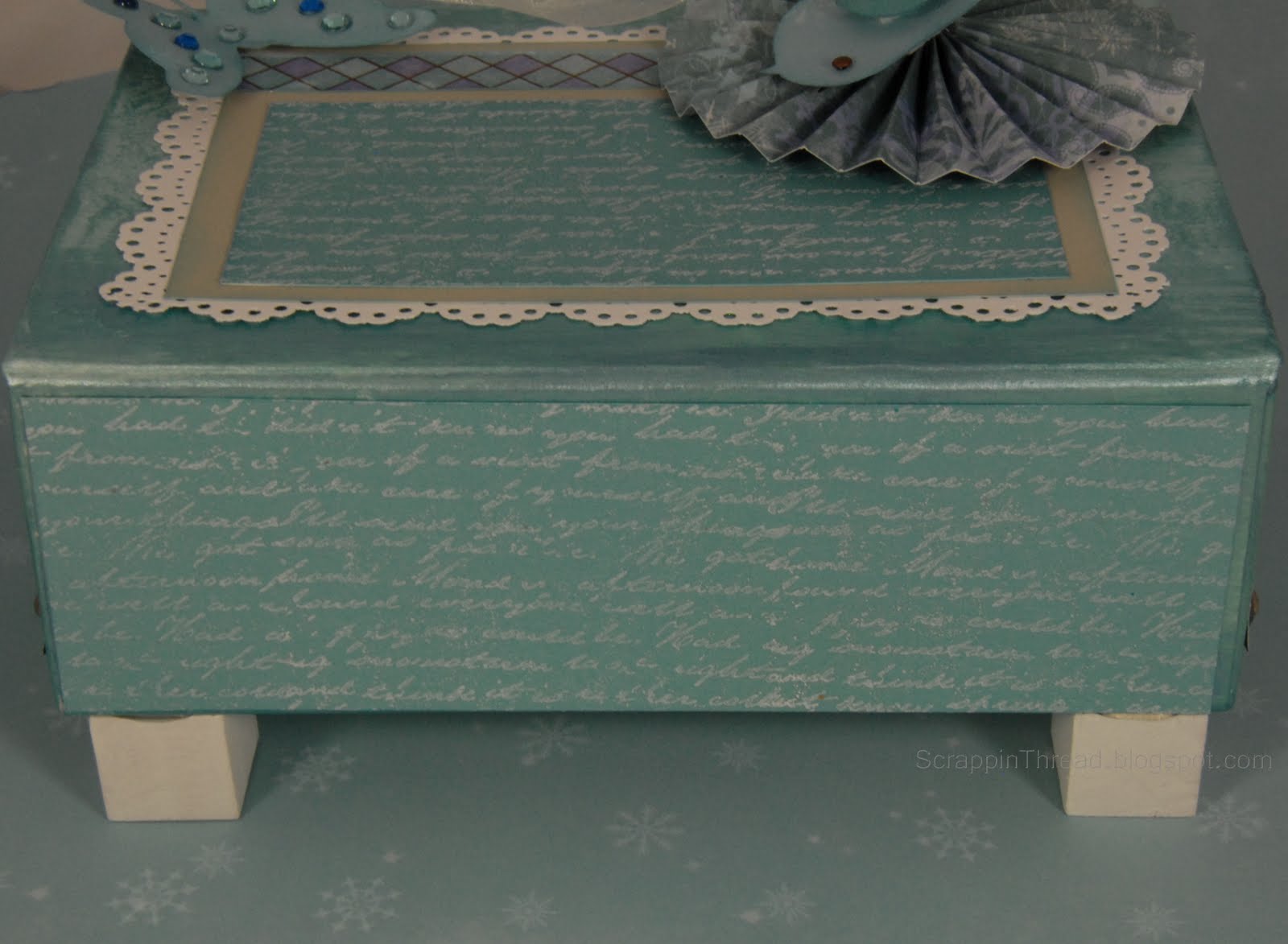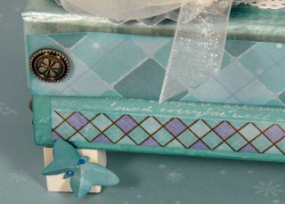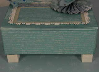 I also painted some little wood blocks with white acrylic paint and glued them onto the bottom of the box.  This is the back of the box with a piece of Crystal Blue card stock stamped in White Daisy Pigment Ink and embossed with Clear Detail Powder.  The image is from the Universal Backgrounds set (D1477).