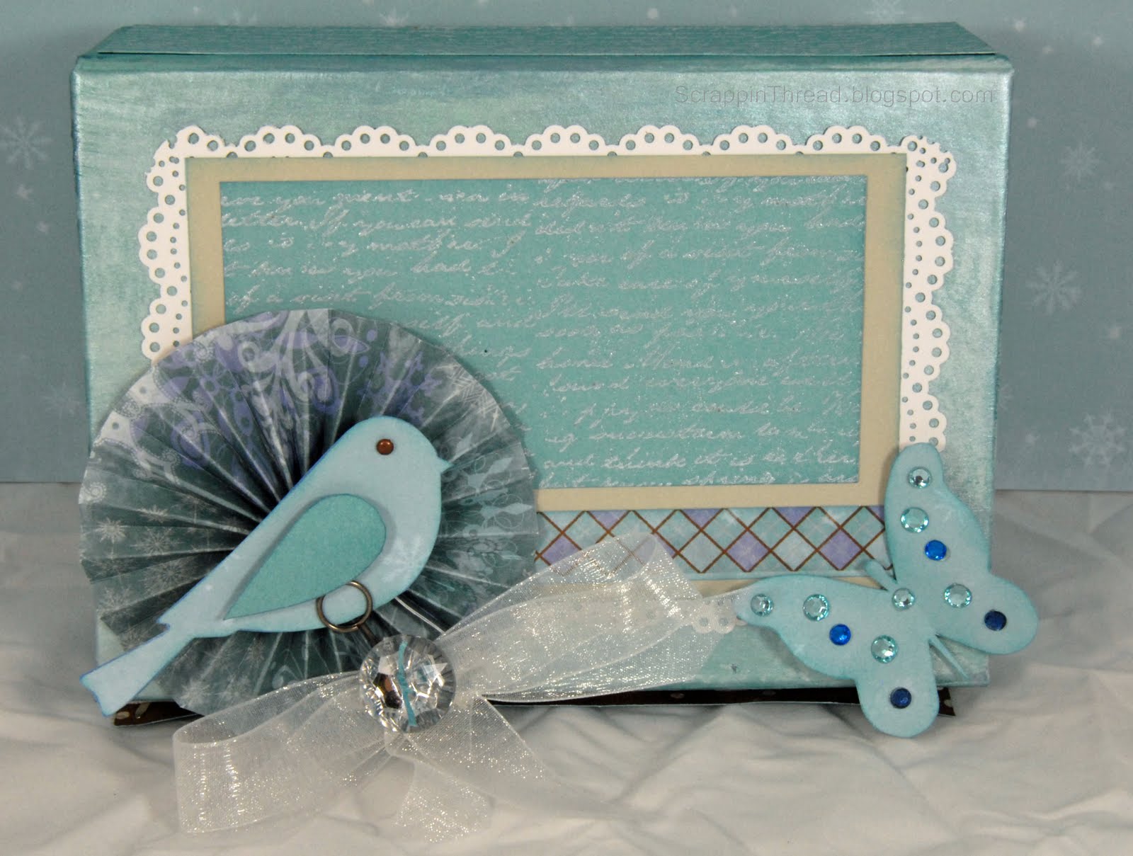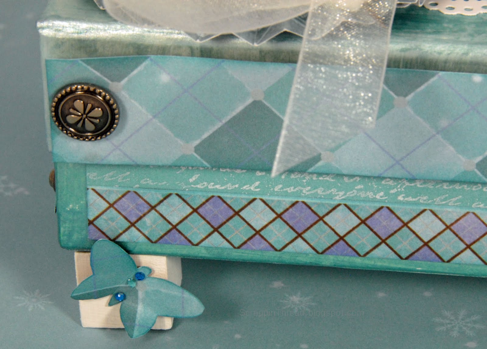 Here is the top of the box with a paper rosette made from the same paper pack.  The button on the bow is from the new Bling Assortment.   The Sparkles on the butterflies come from the Blue and Green Assortment.