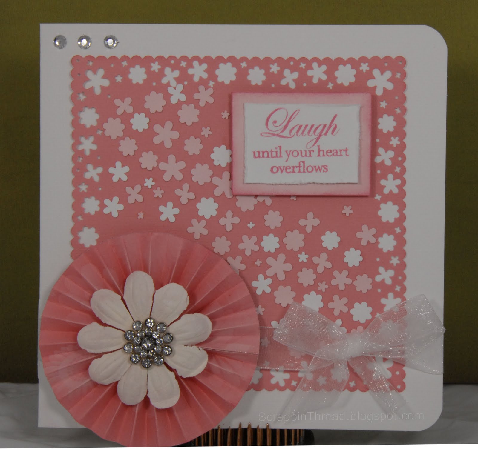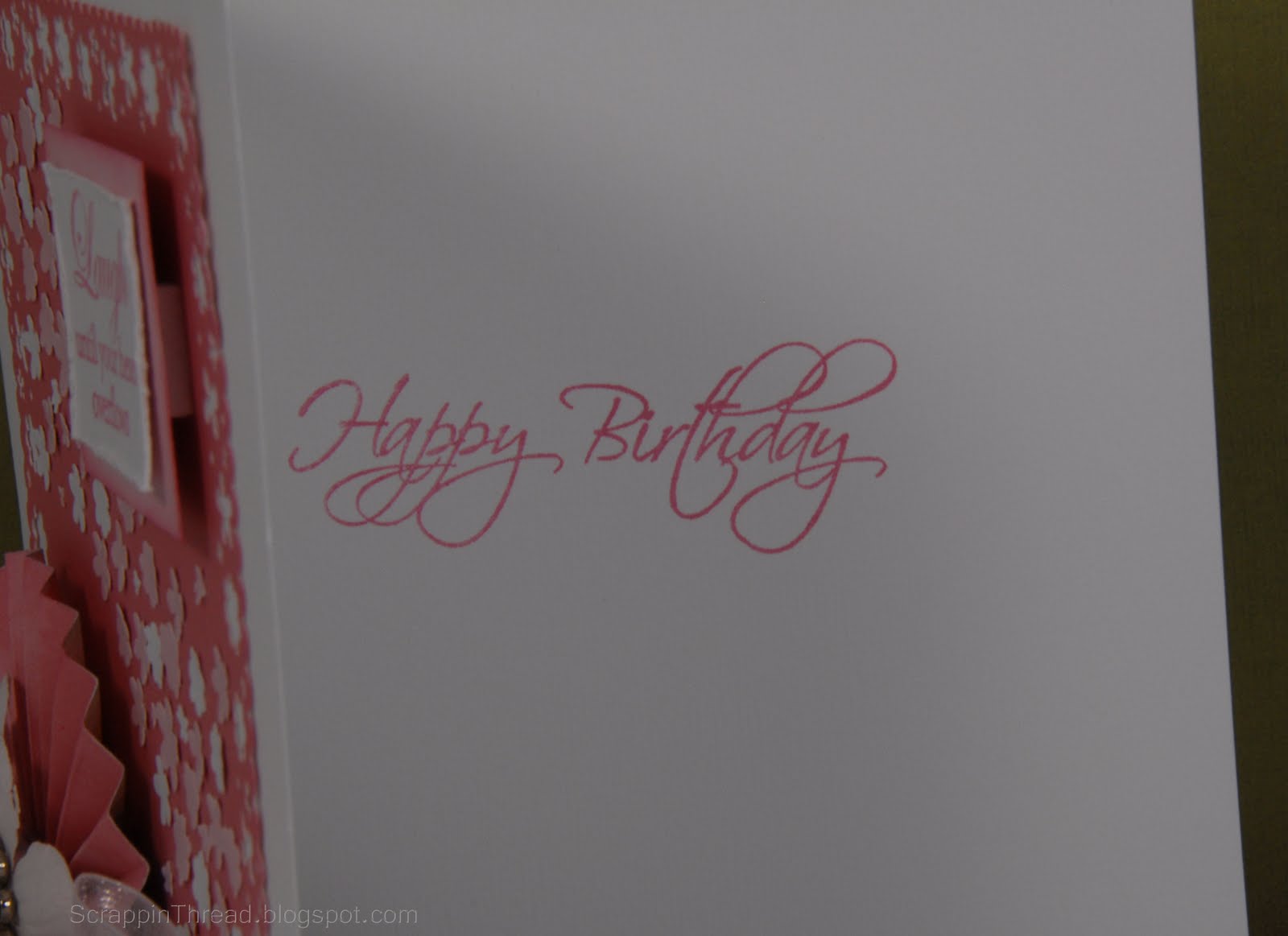 It may appear that I’m on a Martha Stewart Around the Page Punch kick. Ummm, maybe so. Here is another 6″ x 6″ card made with the Flower Shower punches. I glued all the little flowers from the punches onto the 5″ x 5″ cardstock center. The following picture of the inside sentiment shows the 3-dimensionality on the front a little better.