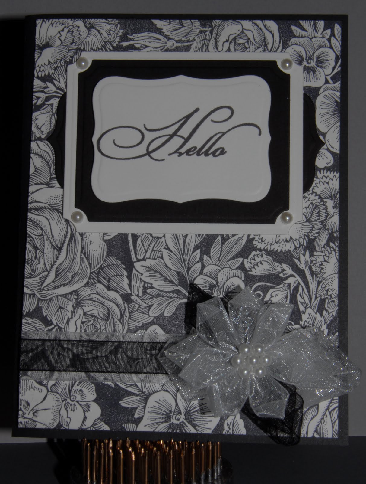 I really like monochromatic and two color designs. Whether it is in quilts, home decor, or paper crafts…. it doesn’t matter to me. I’m always drawn to the simplicity of fewer colors. The other day I had stamped this big floral background stamp with black ink on white cardstock but didn’t use it because I decided it should be embossed. So this was my leftover discard from that day. Of course, I rarely throw stuff away so it’s been sitting here waiting to be made into a card.