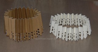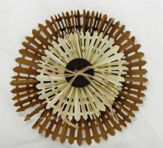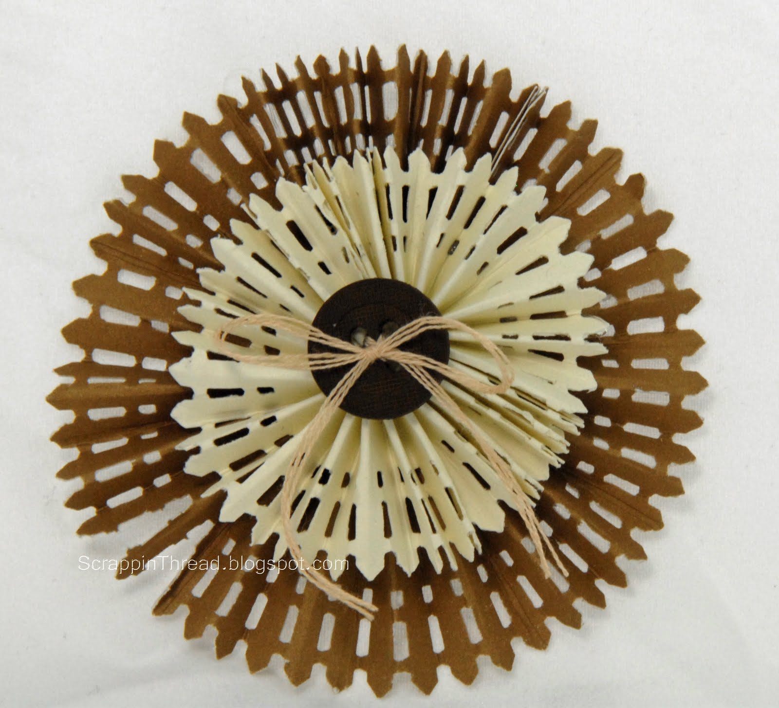 When making the pinwheel/rosettes that are on lots of my artwork, I usually score the card stock at 1/4″ increments.  I decided to do the same with these.  After hot gluing them flat.  I stacked them.  Added a button and voila!  A new flower design.