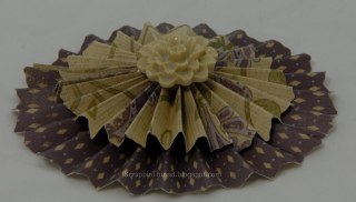 I decided that I wanted the flower to be one layered flower rather than 3 separate flowers glued on top of each other. So at this point it looks sort of like a little lampshade. I used hot glue to get the rosette to hold it’s shape once it is pushed down into a pinwheel.