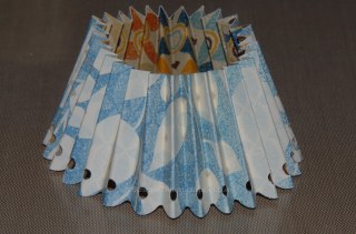 The two strips are 12″ long. One is 1″ wide, the other is 1 1/2″ wide. The strips are punched with the Fiskars edge punch. Each peak and valley is scored and folded accordion style. The ends are glued together to make a continuous loop with makes a little lamp shade looking thing. See below.