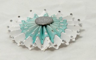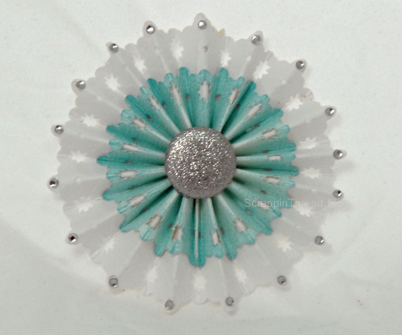 The tips of each “petal” were adorned with CTMH’s Bitty Sparkles and the center is a Silver Shimmer brad measuring 5/8′ across. The finished flower is 2 3/4″ in diameter.
