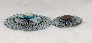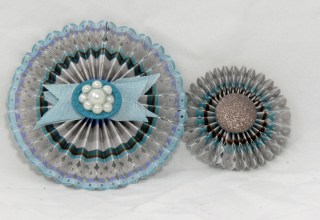 These rosettes were made from 12 inch long strips. The larger rosette is made from a 1 1/2″ strip. The smaller one is a 1 inch strip.