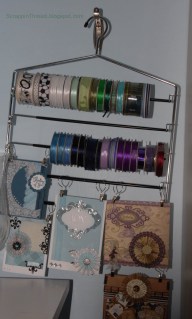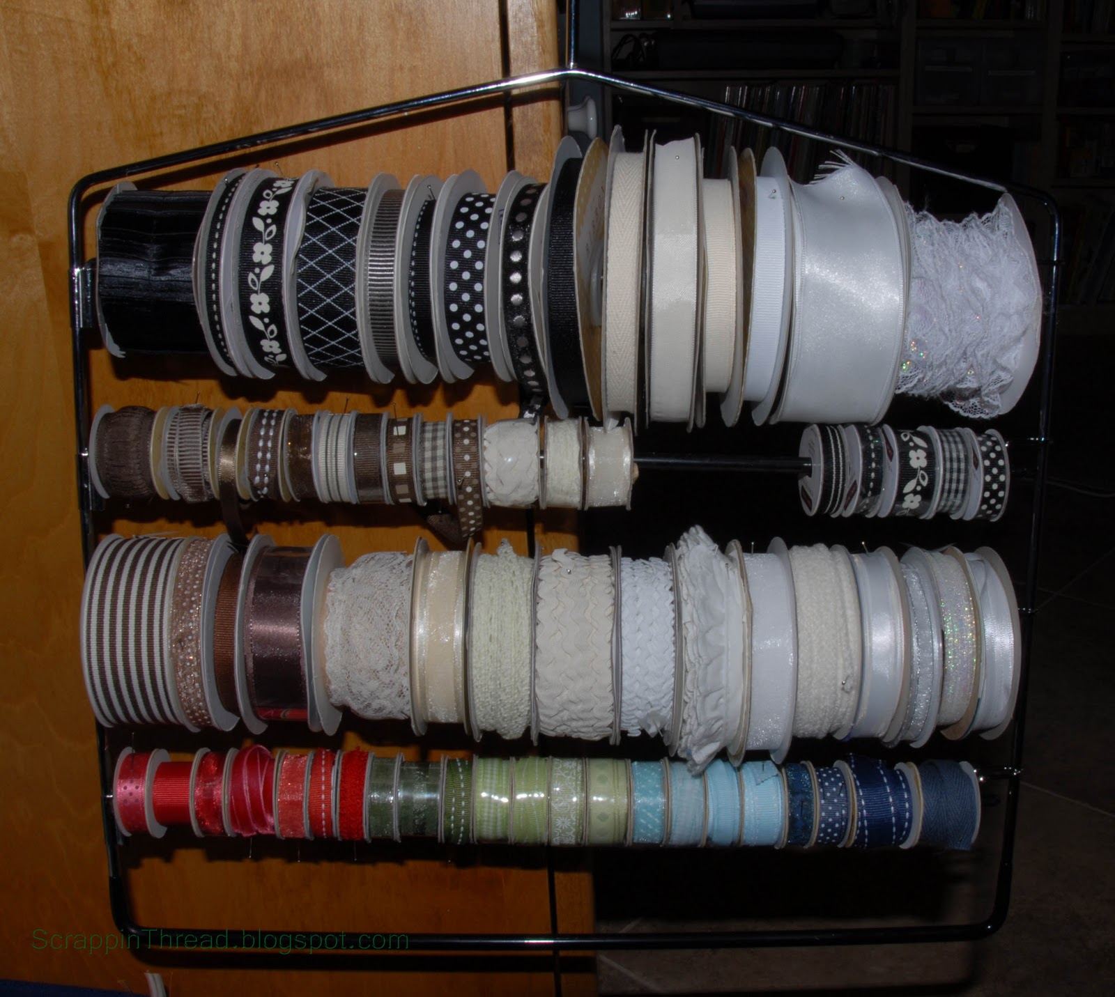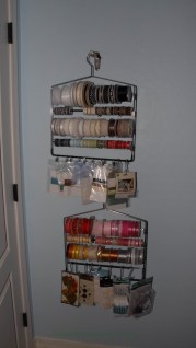 The wooden organizer with dowels was inexpensive (from Oriental Trading, I think) but it drove me nuts to use because the ribbons came undone constantly, I tried putting a little piece of tape on the ends of each ribbon to hold it in place. That worked ok until the ribbon had been used enough so that it was hard to reach into the spool to apply the tape. Now I use tiny applique pins to keep the ribbon from unfurling.