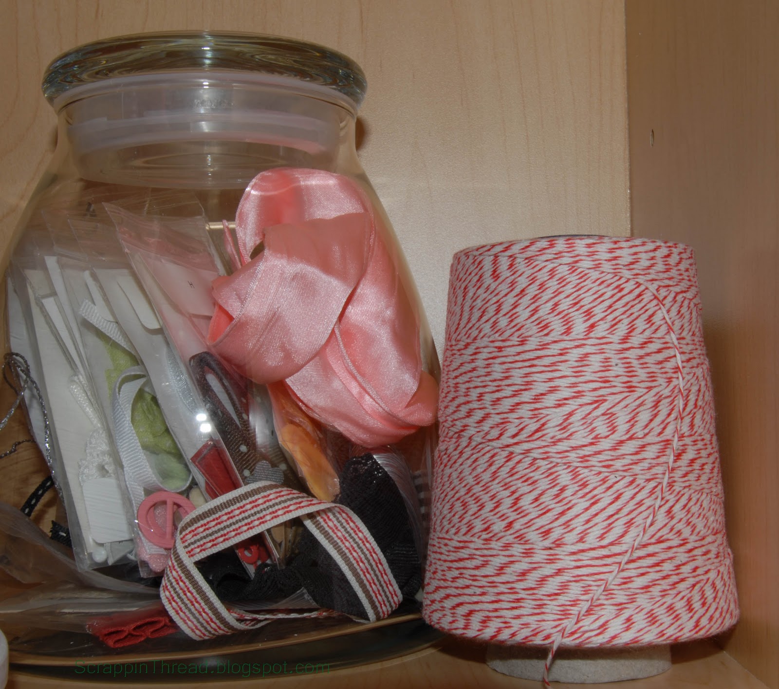 The photo with the wooden ribbon organizer shows a jar with lots of ribbons rolled onto clothespins. This system works well for smallish lengths of ribbon. It looks pretty and is fairly easy to access the desired ribbon. Sort of hidden behind that jar is the bakers twine and a hodgepodge/junk jar. The junk jar has scraps of ribbon and odd bits of other stuff.