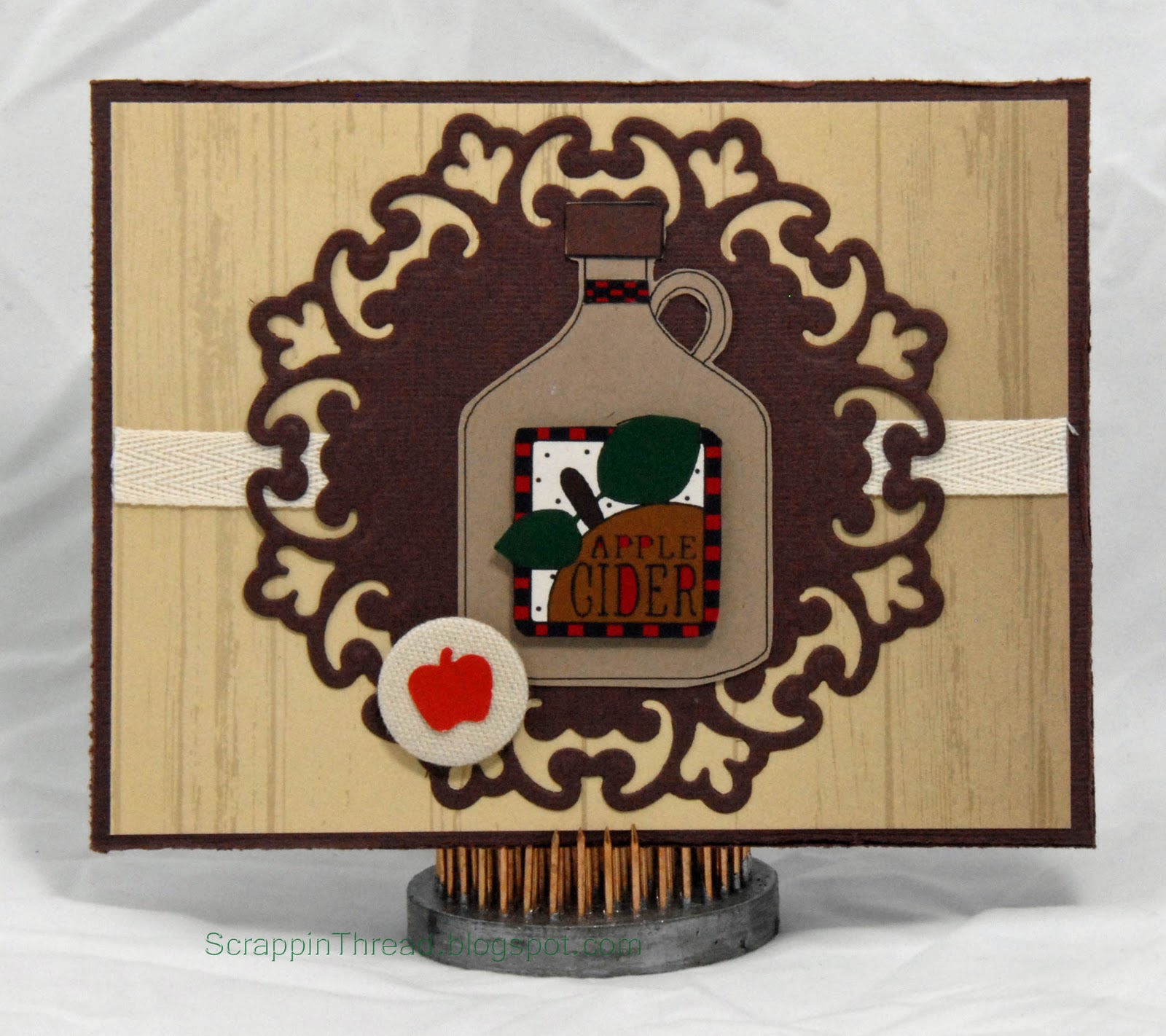 The brown textured cardstock was cut with a Spellbinders die and layered over an old background piece of paper with a twill ribbon underneath. The canvas button is made from a very similar material to the twill. The punched red apple offers a nice pop of color on all the neutral tones.