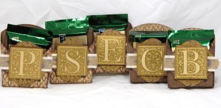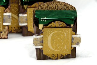 While working on a different project I came up with this cute placecard/after dinner mint combo.  Each person’s Baroque Alphabet monogram was stamped with Versamark on Bamboo cardstock and embossed in gold.