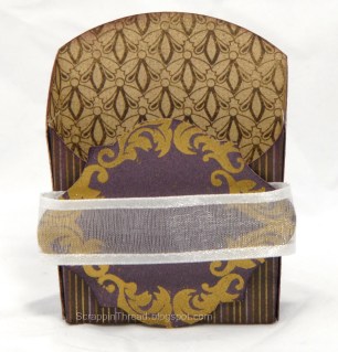 The box was made using the Shape 6 Font Layer/Shift.  (The label/tag is from the same Art Philosophy Cricut cartridge as the french fry box.)  After cutting the label, I stamped it and embossed it in gold. Then I layered a piece of organdy ribbon on top of it and popped the cut out monogram with foam tape.