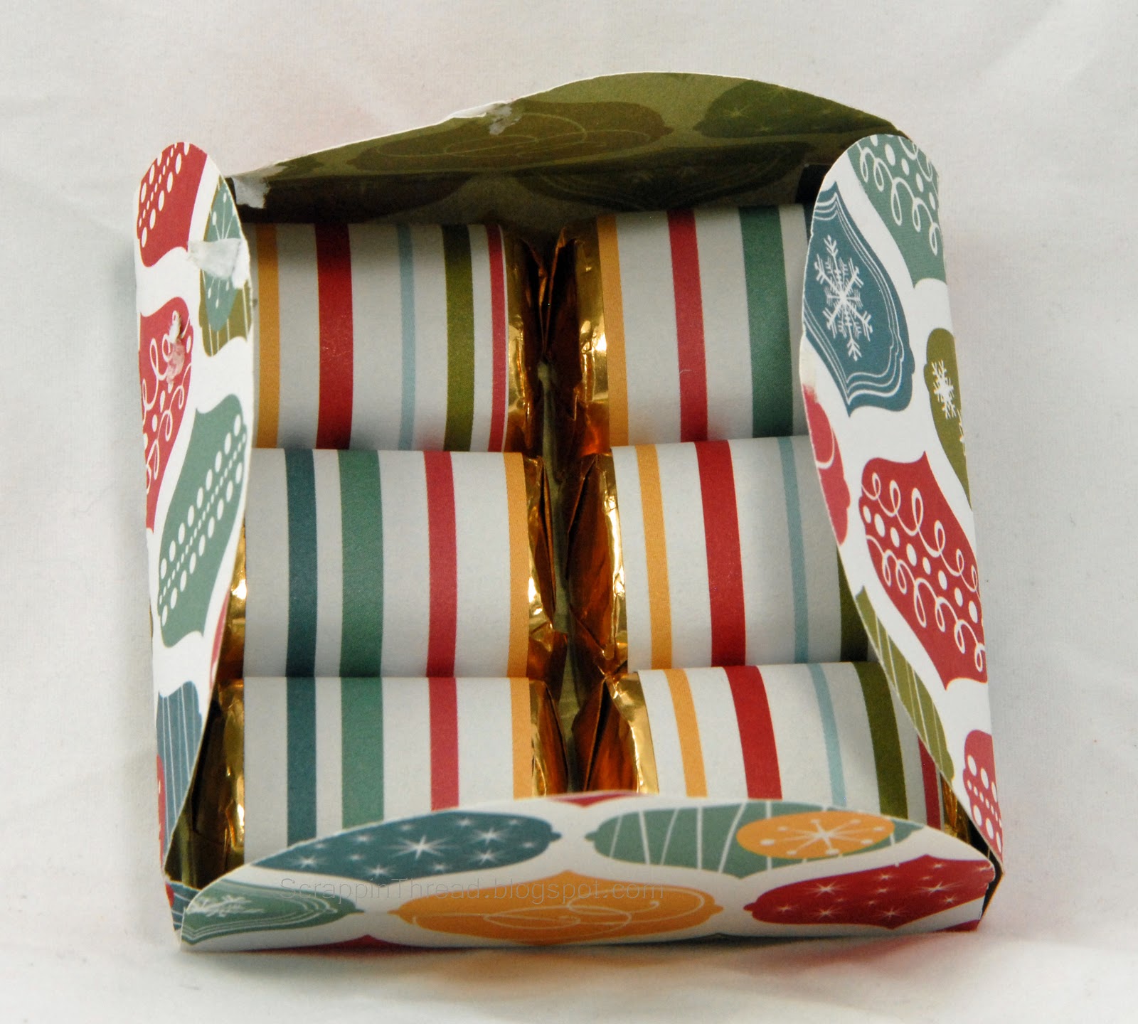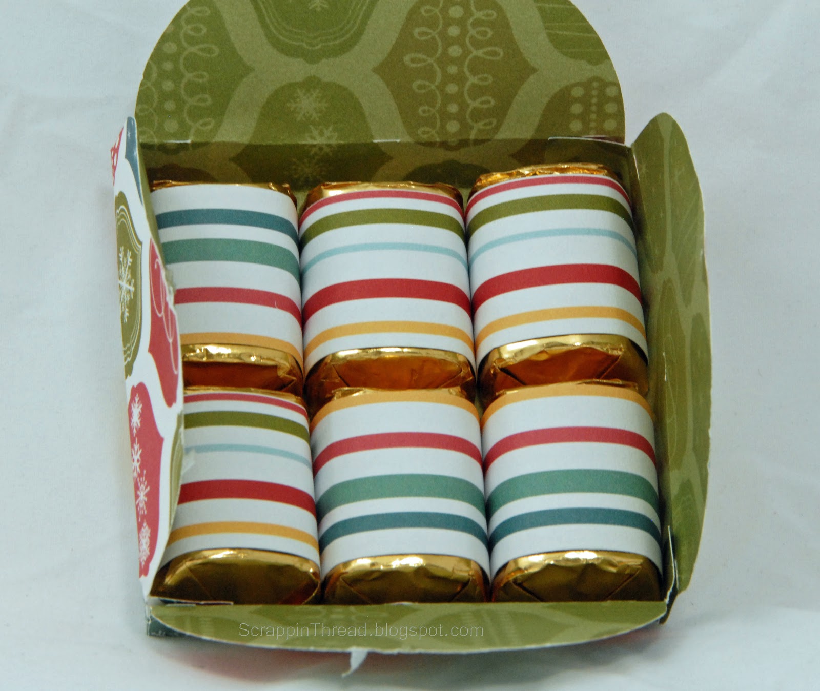 In order to fit 6 pieces of Hershey’s Nuggets With Almonds in the box, I cut it at 6 1/2″. I used scraps from the Jingle paper pack to wrap the candies for inside the box. Each piece of paper is approximately 1″ x 3 1/4″. A glue dot holds each strip in place on the underside of the paper in back.