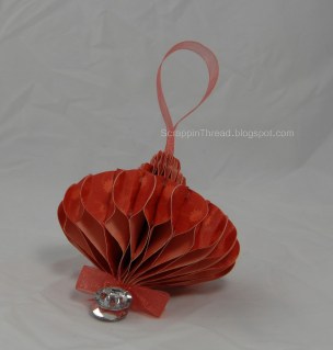 The ribbon matches the retired Evensong B & T paper. Any color of two-sided thin paper would work beautifully. I am trying to use up my stash of papers and ribbons, so that is why I chose this patterned paper. The new CTMH paper is too thick for this type of ornament. I’m making some other ornaments out of cardstock that I’ll post soon.