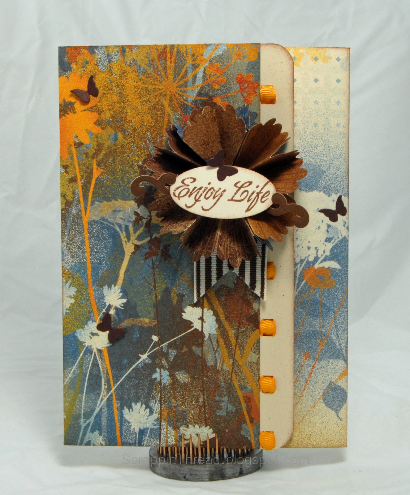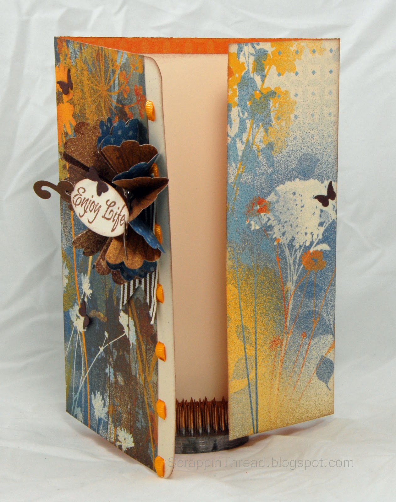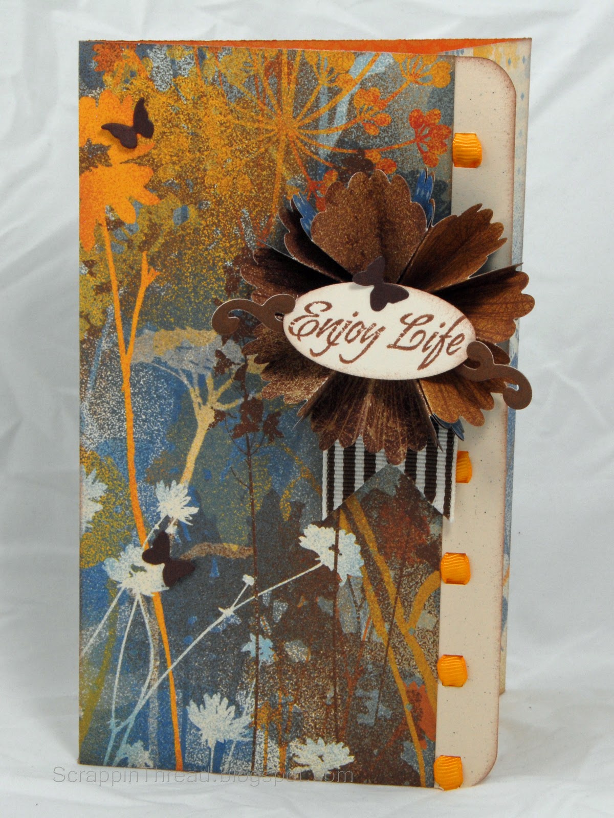 Everyone in the house has been sick sometime during the past three weeks, so I’ve not been able to work on much of anything. I finally got a chance to play a little bit today and made this very quick card. It was quick, mainly because I had several of the pieces done already. Namely, the big flower on the front made with three cuts from a Spellbinders die that I cut, scored and folded into a chunky 3-d flower.