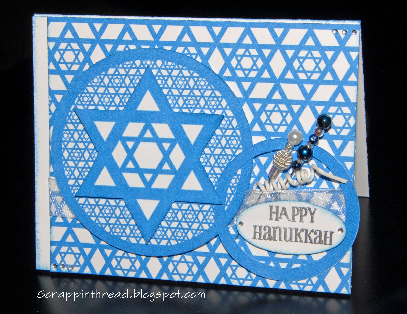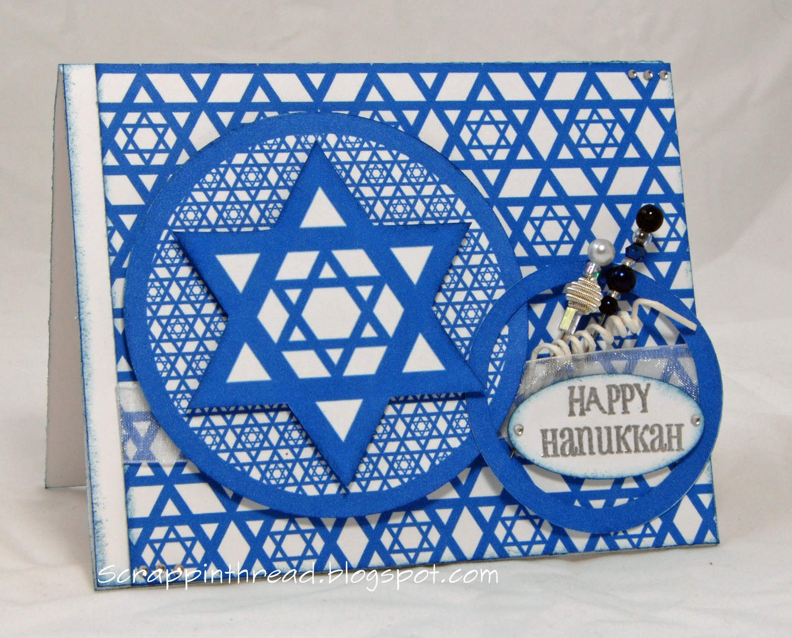 All of the shapes are popped off the card base with foam tape. The oval with the stamped sentiment is a SU! punch. The rest of the shapes were printed on my HP printer from the Silhouette software onto plain white cardstock. After the printer puts registration marks onto the page, the Cameo can accurately line up the cutting lines to make perfect circles or whatever shapes you draw in the software. Or it can cut purchased cut files very quickly. On this card, I didn’t use any purchased cut files. I ended up fussy-cutting the large Star of David, but the rest were all cut with the Cameo.