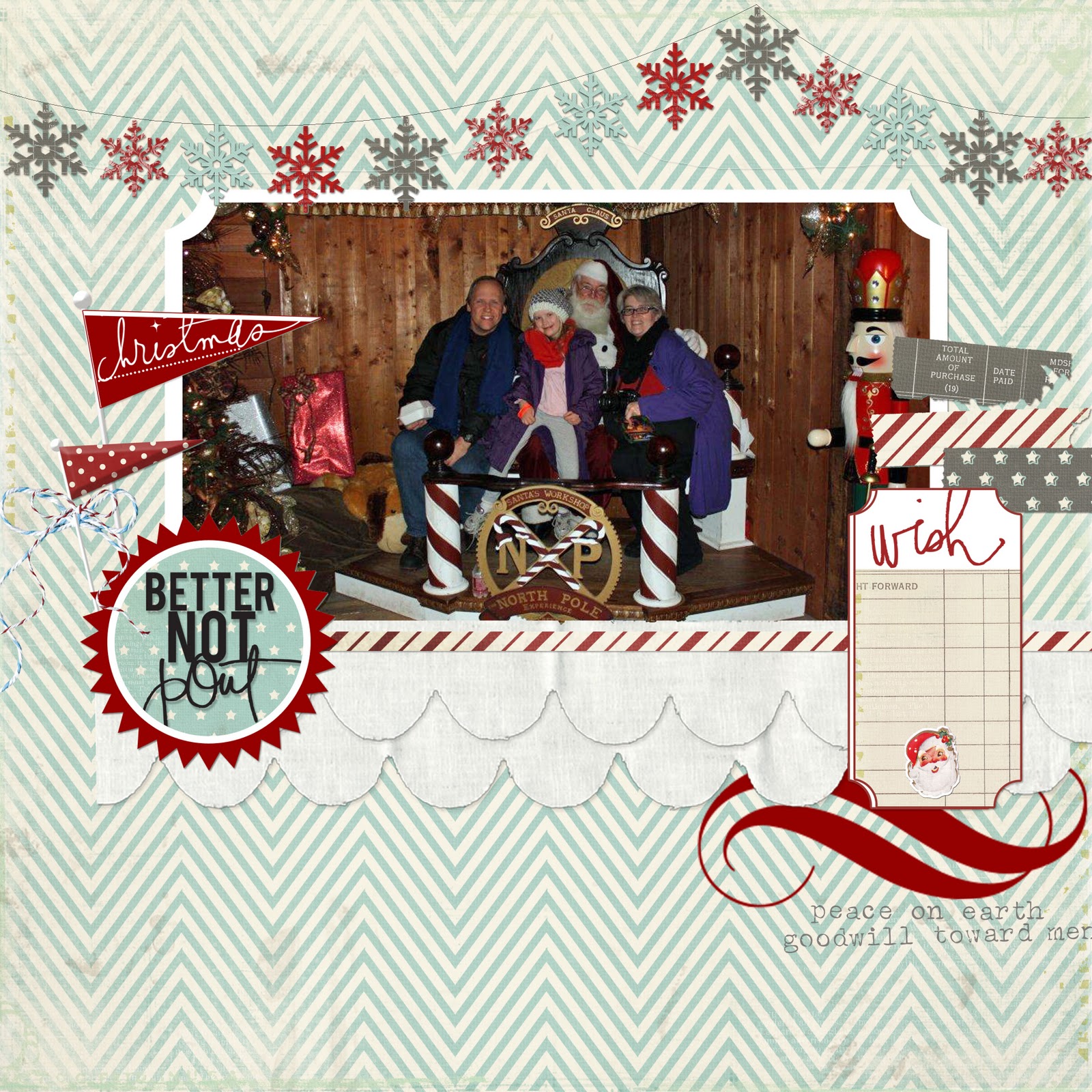 Last week we drove up to Greer, AZ to visit Santa at the North Pole Experience. It was fun, cold and a very long drive! After driving 4+ hours each direction, I was thrilled to use the fabulous freebie layout from JessicaSprague.com for the picture we got from the NPX elves. I have some cute tags that I made that I think will look great on here once it is printed. Many of my layouts are becoming hybrid creations with a mixture of digital and traditional scrapping.