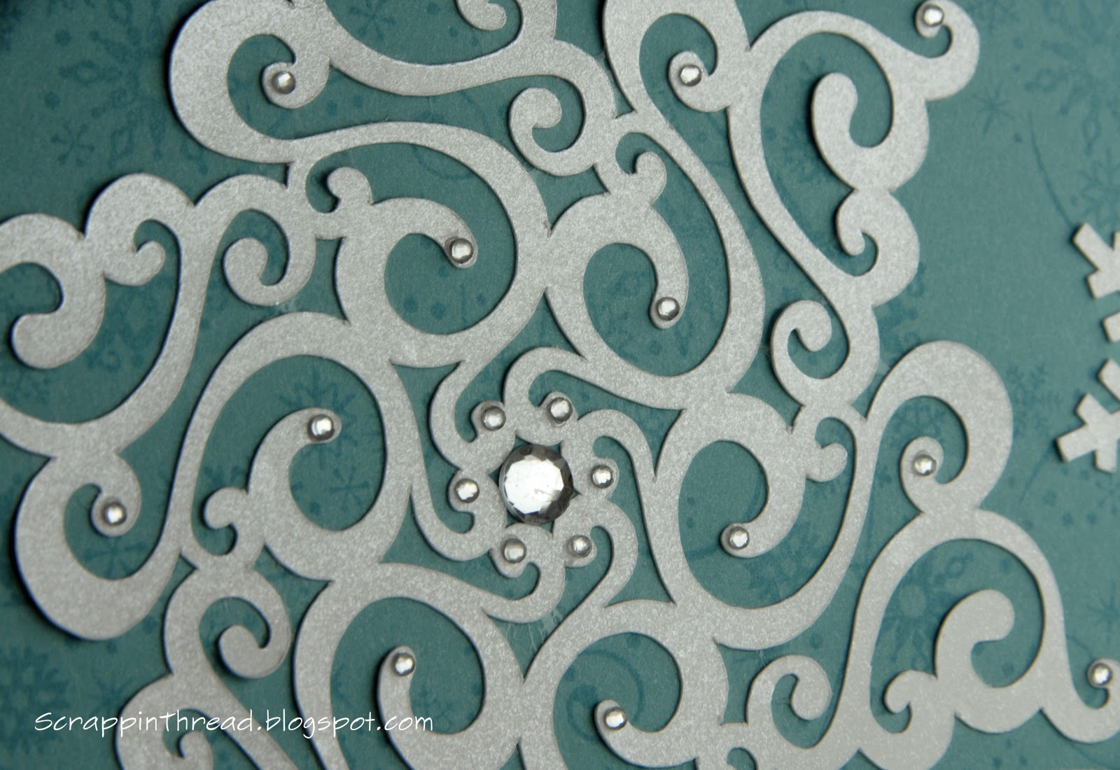 The card base is Crystal Blue CTMH Cardstock stamped with Crystal Blue ink using one stamp from the Snow Flurries set. White Daisy cardstock was cut using a blade depth of 4 at a speed of 3 using the double cut option through the software linked to the Cameo. For even more intricate cuts that I’ve used on upcoming projects, I slowed the speed to 2. This was with a new blade, btw.
