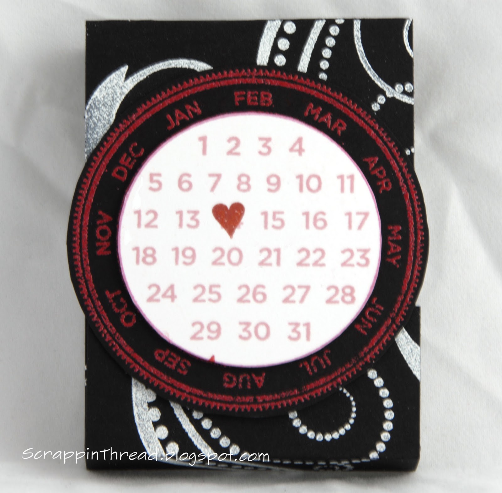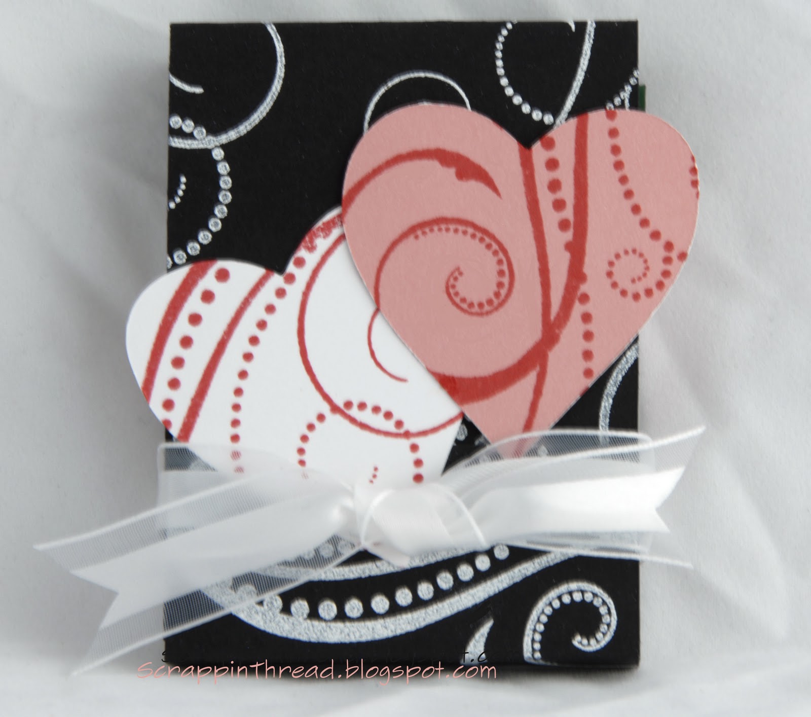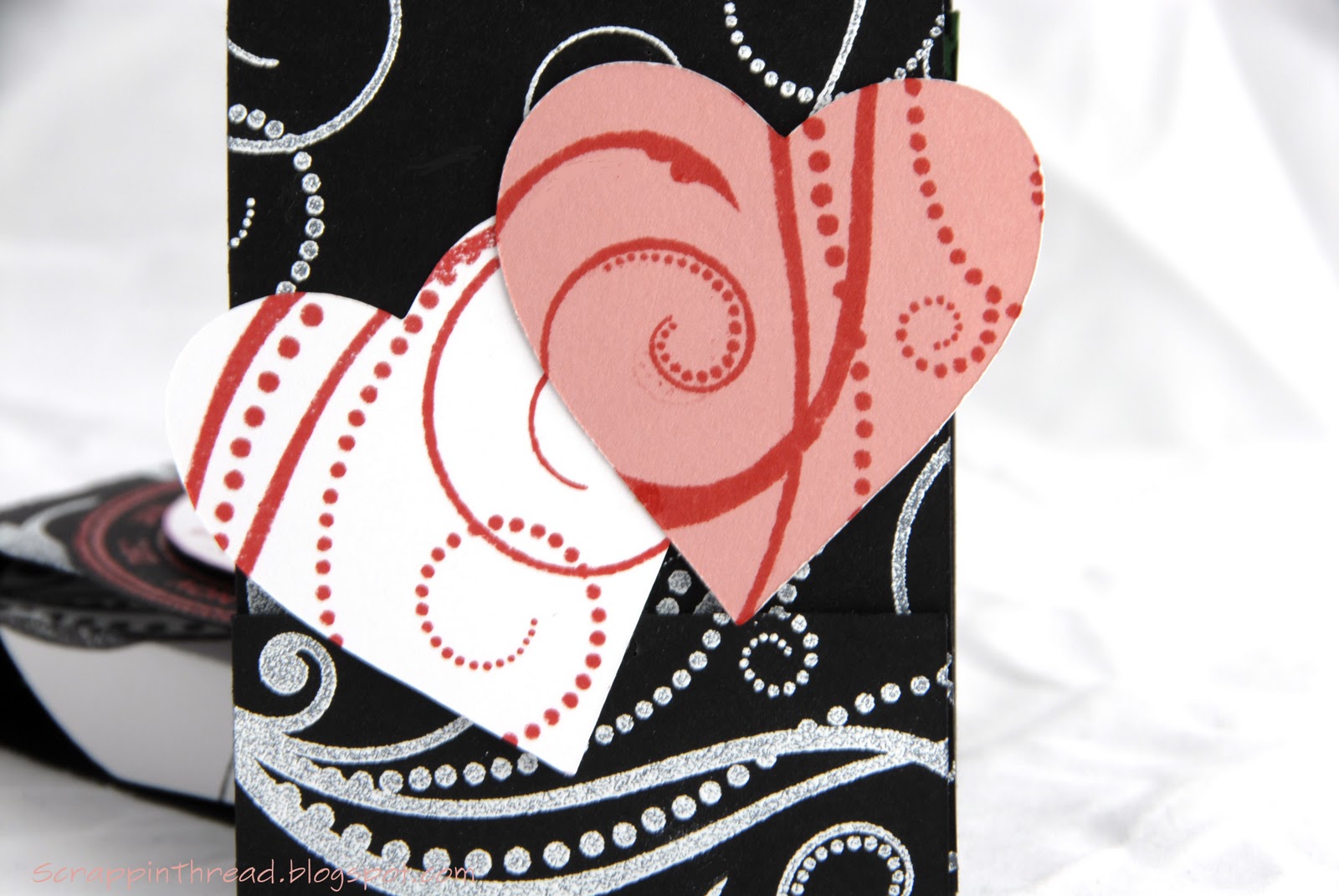 The big swirl stamp from the CTMH Love Life set was stamped and embossed with white on black card stock. It was also used with Holiday Red ink on white and Blush colored cardstock to decorate the hearts shown below. They were cut using the AP Cricut cartridge.