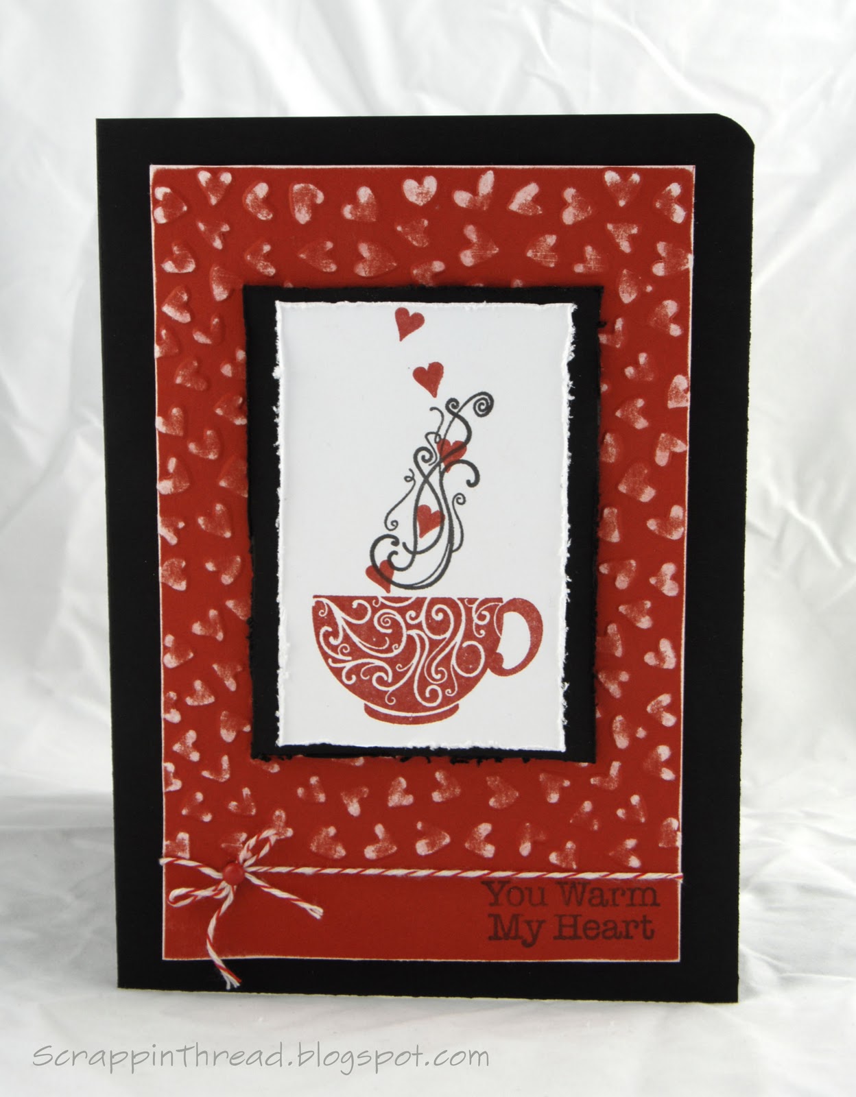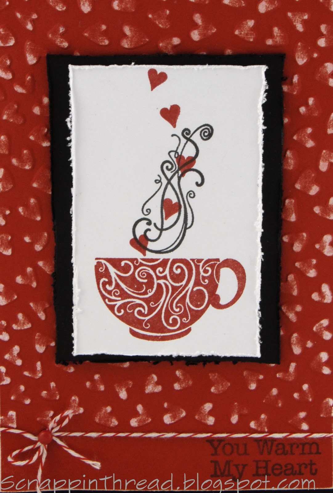 The ink for the cup and heart is Cranberry. I used a Cranberry brad to form the center of the baker’s twine bow. The steam and sentiment are stamped with black ink. The little heart image comes from the CTMH Love Life set. The card base is black cardstock. This can be written on with a white gel pen or a light colored insert can be adhered inside the card.