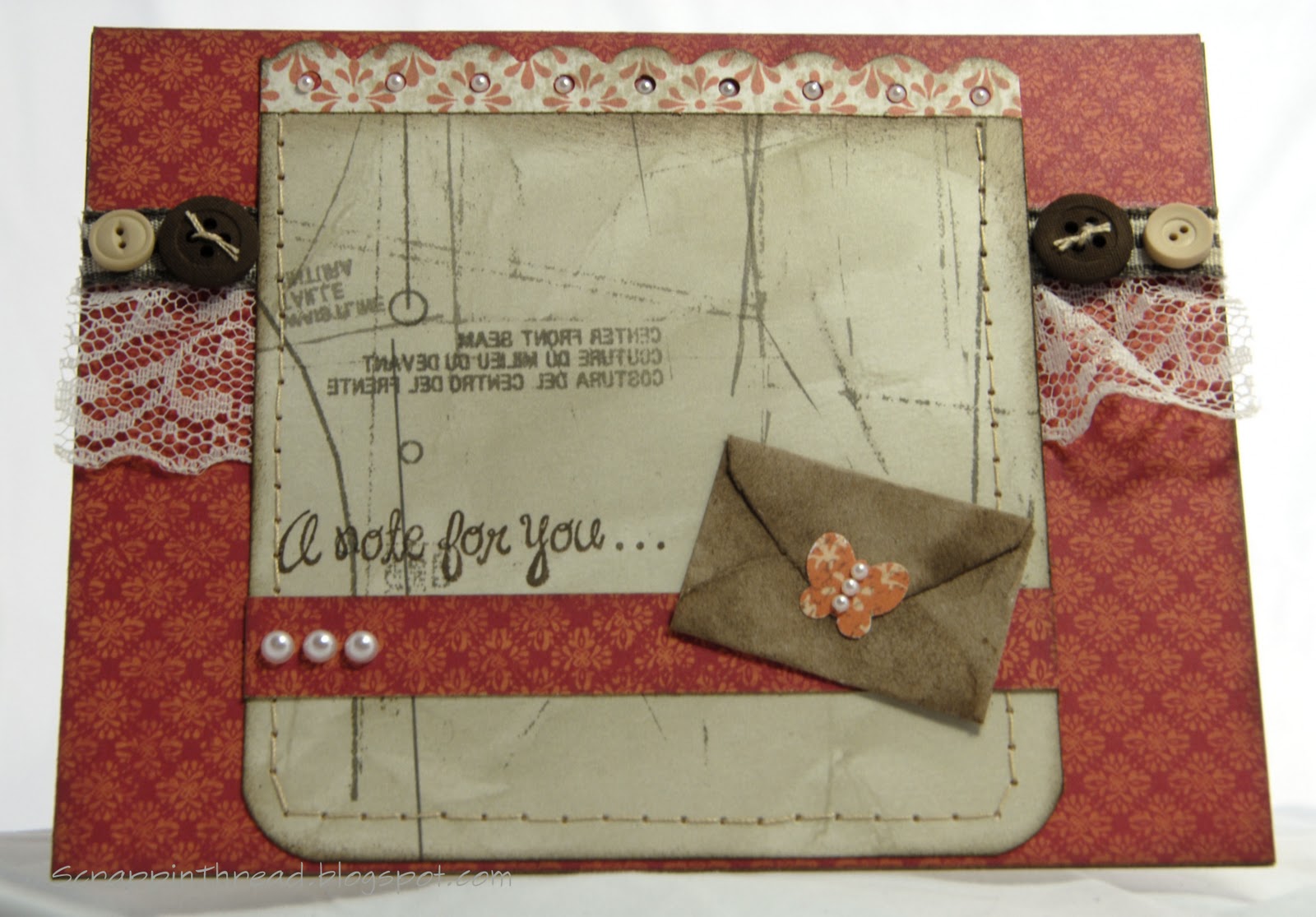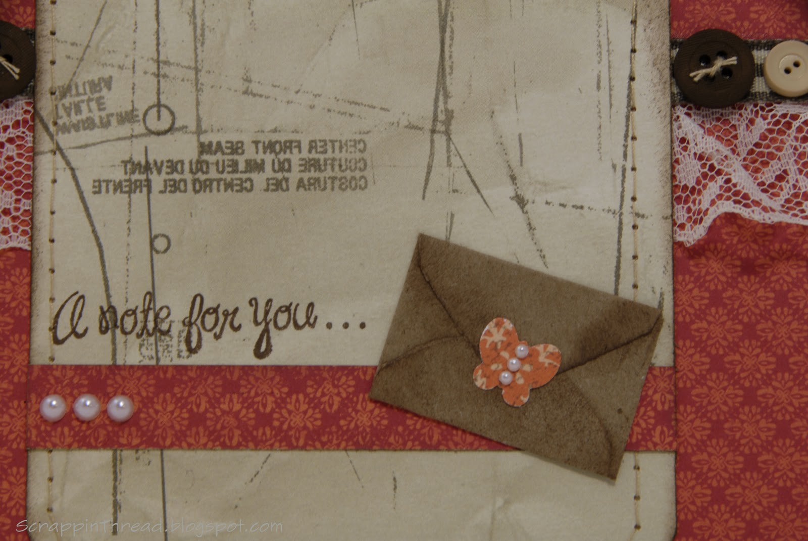 I wanted an old looking envelope so I used a paper bag to punch out the shape. It needed a little doodad to seal it and the small butterfly punch was the perfect size. All of the paper edges were ink distressed using Cocoa ink.