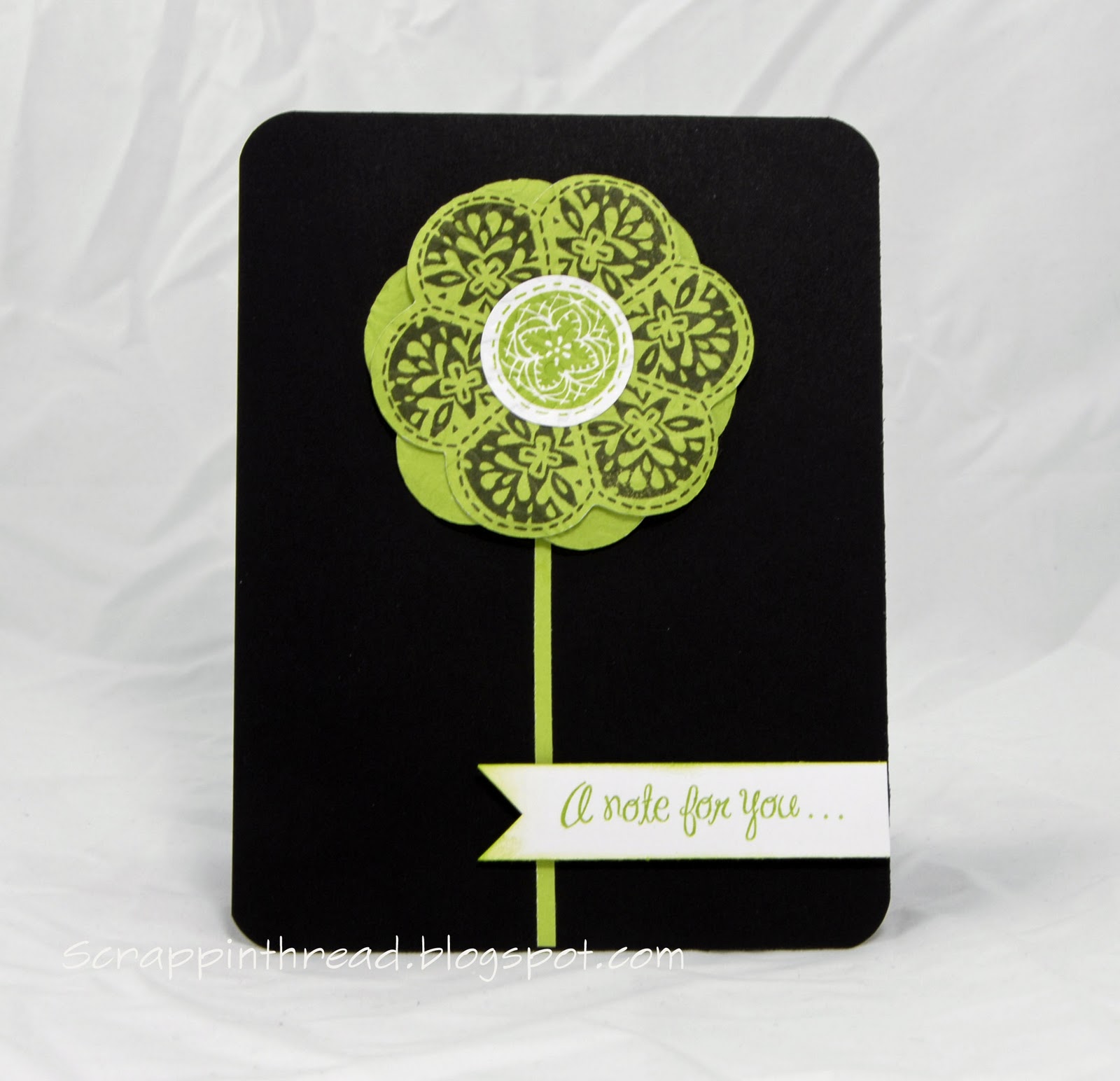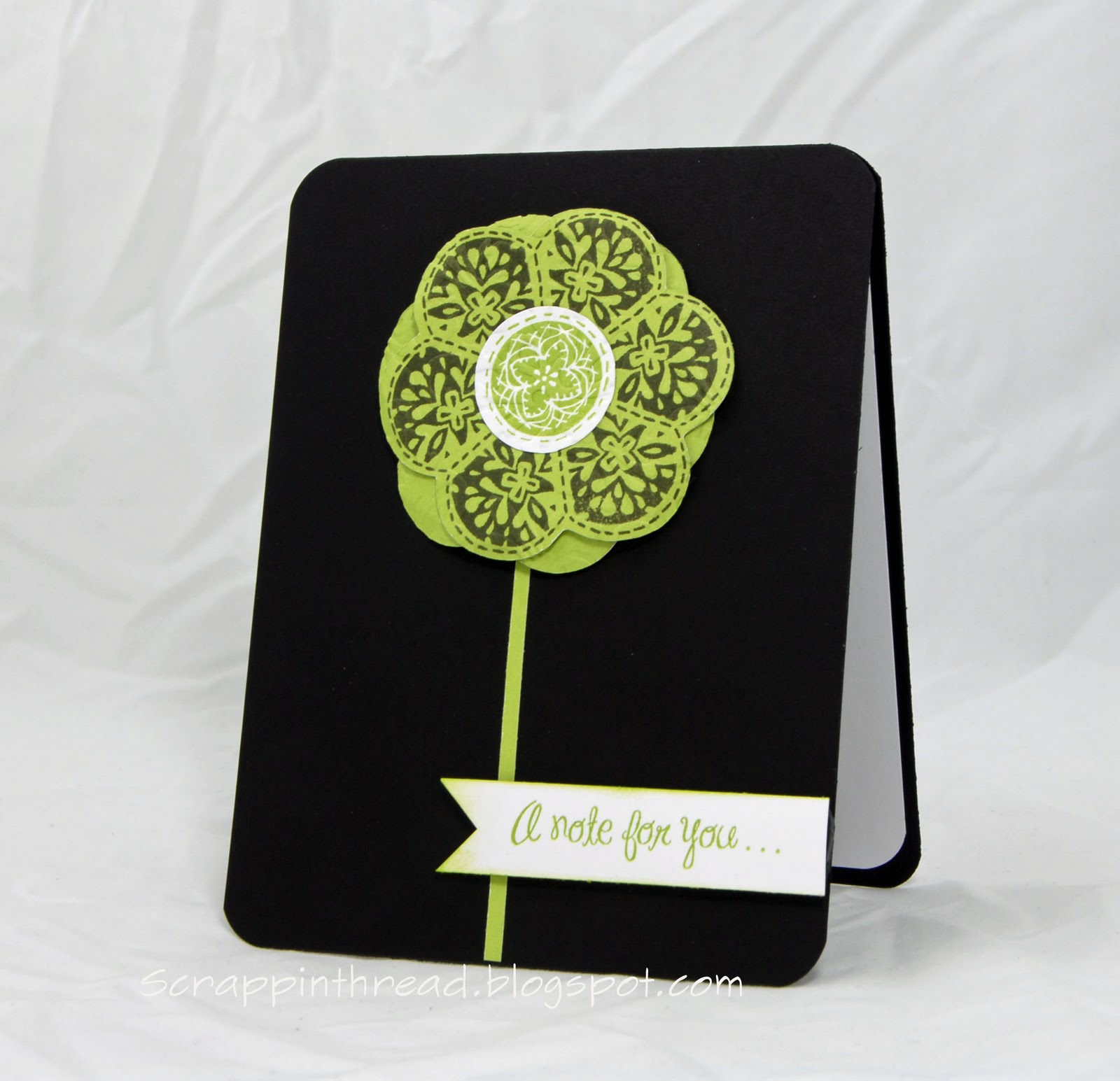 This card is stamped with the new CTMH Just For You stamp set using regular dye inks in black and Pear. The cardstock colors are black, Pear and White Daisy. After the layers were stamped, they were adhered together and run through the Cuttlebug with the Kassies Brocade folder to create a thick one-piece flower. I pulled the petals apart a little bit because I mainly wanted to have the center part embedded.