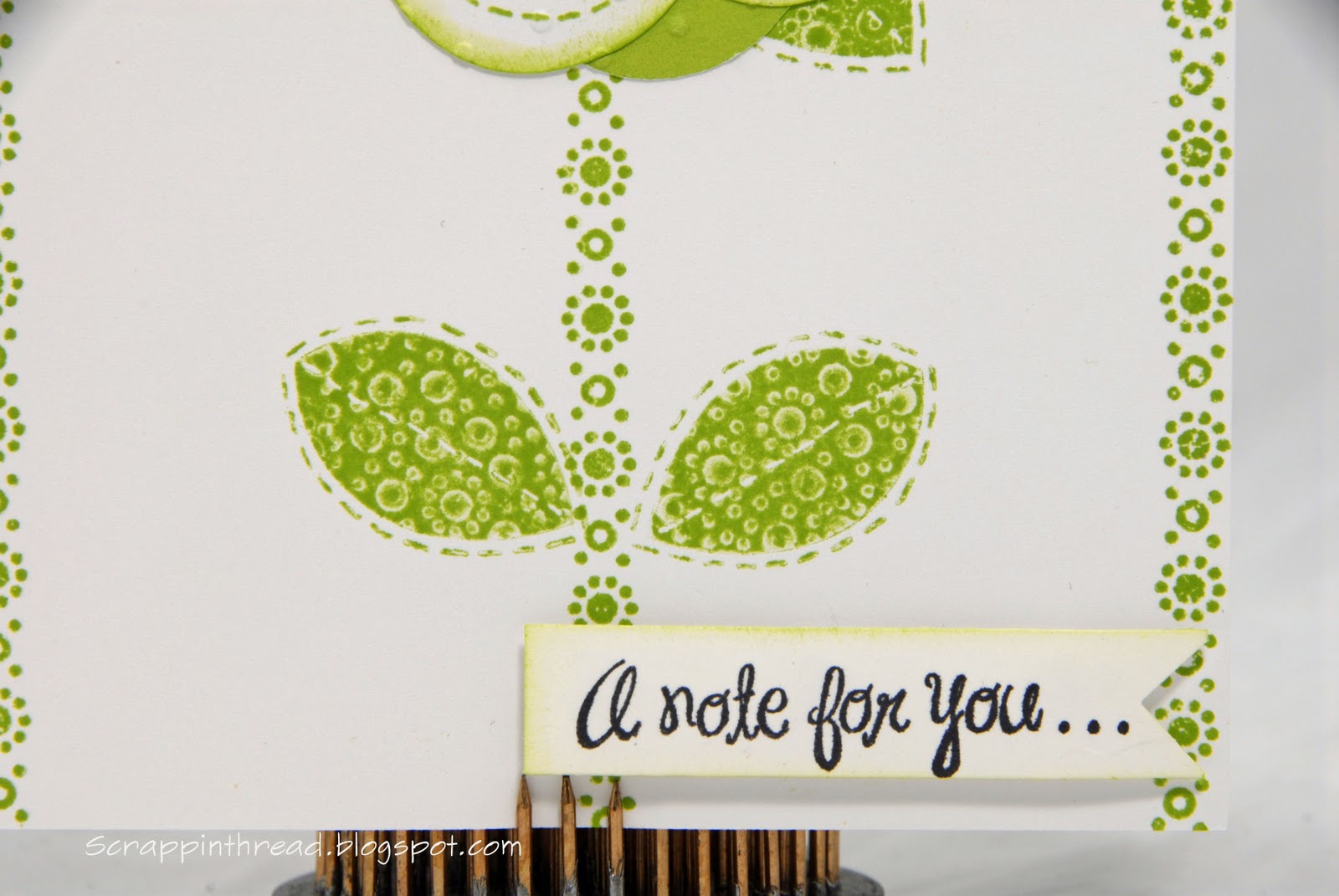 The petals were easy to make using two different colors of dye ink. This can easily be done with stamp pads or markers. After the components were stamped and inked they were embossed with the Swiss Dots Cuttlebug folder. All stamps, papers and ink are from CTMH. I used Pear, White Daisy and Black. The border and background stamps are retired. The flower, petals, leaves and sentiment are from the new Just For You set.