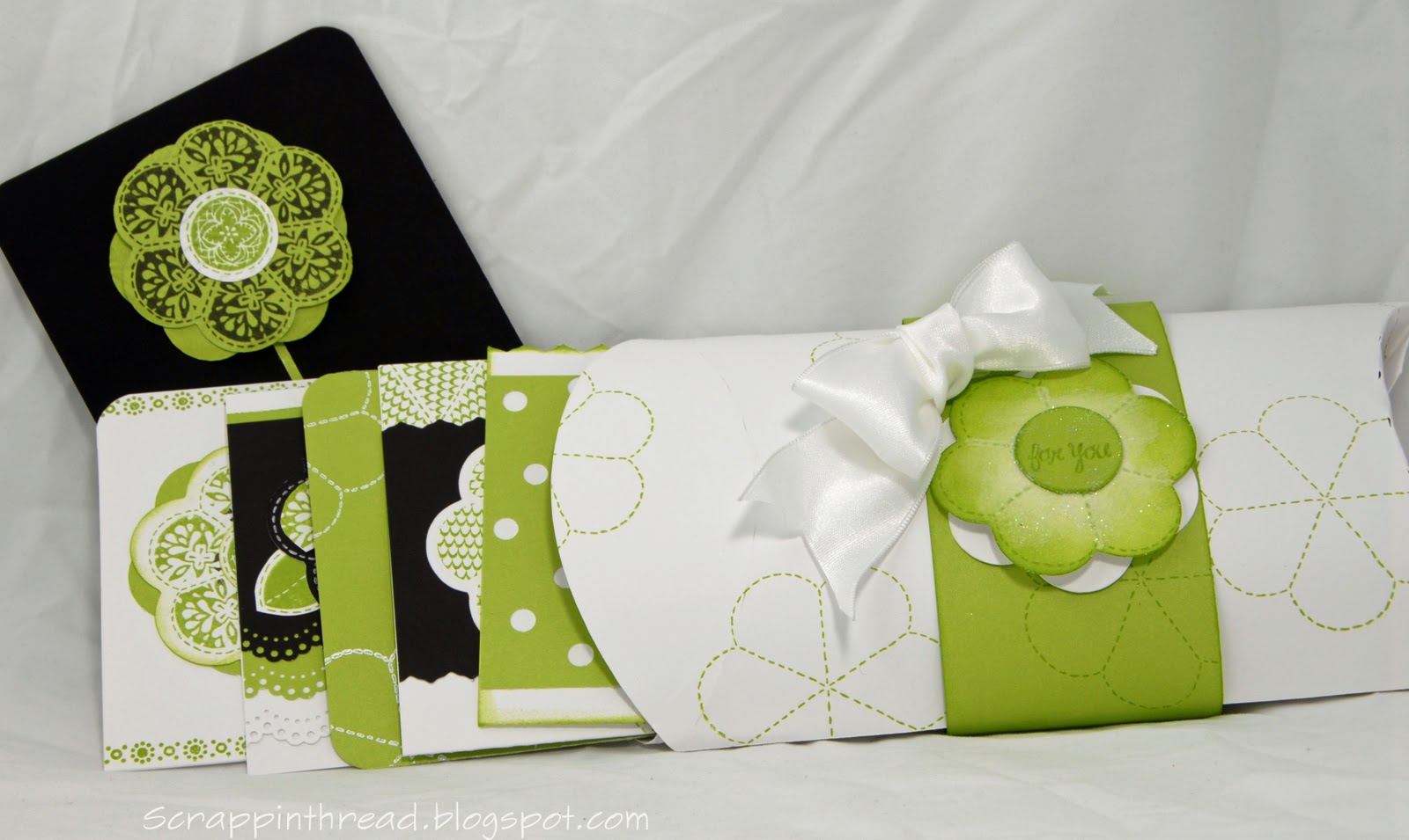 This pillow box will accommodate six standard cards and envelopes. The cards pictured are the ones that I have been sharing throughout the week. It takes one 12 x 12 sheet of cardstock to create the box.  The contrasting Pear colored strip is about 2 1/2″ wide x 12″ to form the belly band.  I used the Cricut to cut the box shape, however there are free templates online if you’d like to cut yours free hand.  Here is a link to two different sized pillow boxes: http://rubberstamping.about.com/od/templates/ss/Pillow-Box-Template.htm. I believe you would need to resize them and use a large format printer or cut and paste to make a large enough template for a card set of this size.