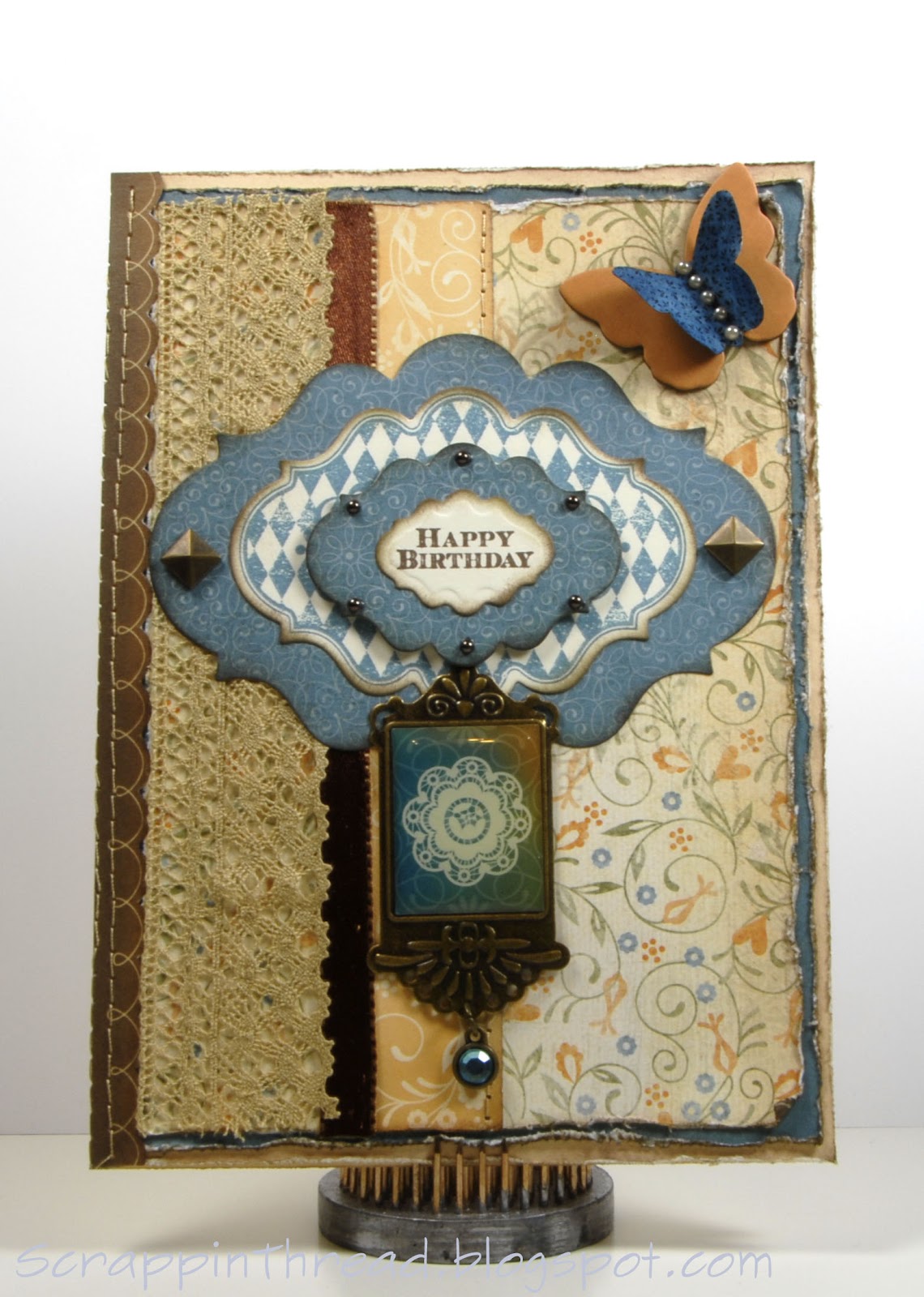If you are a fan of Shabby Chic, you might like today’s card. There are two background layers on the card base, two different ribbons, two paper strips and then the four layer center! Add some pearls, layered butterflies, studs and a charm along with lots of distressing and you have a vintage-y card.