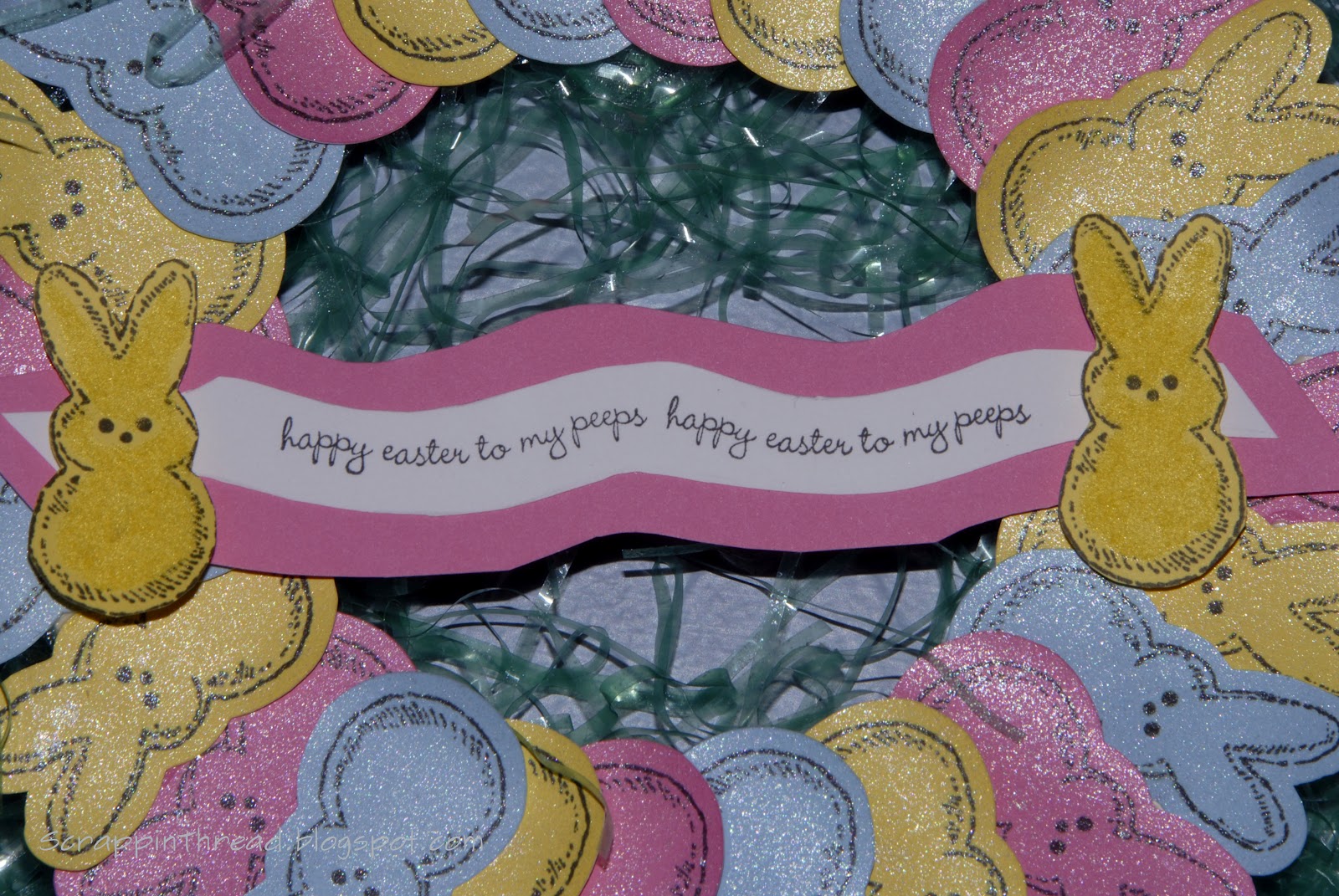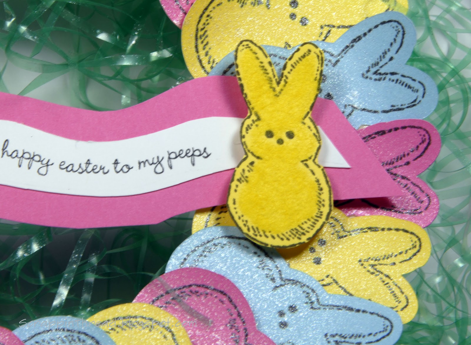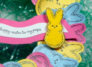 “happy easter to my peeps happy easter to my peeps” is the sentiment on the stamp that comes with the set. I thought it would make a fun banner across the center of the wreath. I used yellow Fun Flock on a couple of the Peeps to anchor the banner.