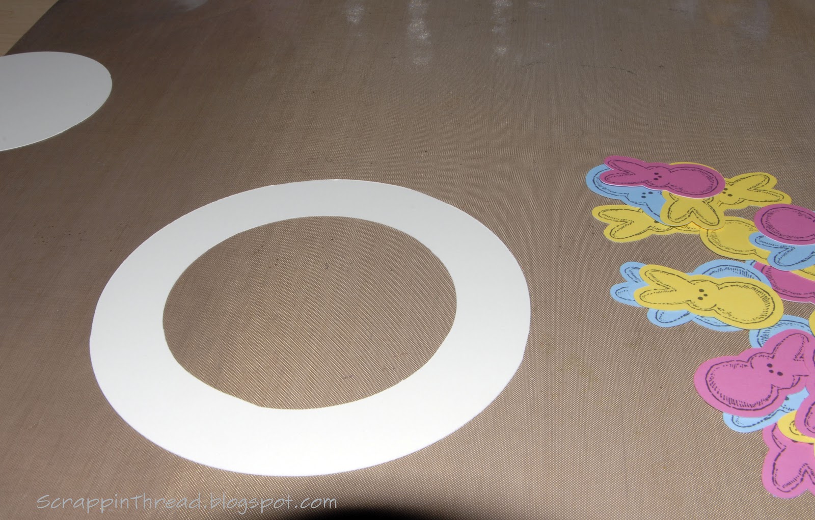 The Cameo cut out lots and lots of Peeps in Bubblegum, (retired) Sunny Yellow, and Sky cardstock. While that was happening, it seemed like a good time to pull out the Martha Stewart Large Circle Cutter and figure out what size wreath to cut.