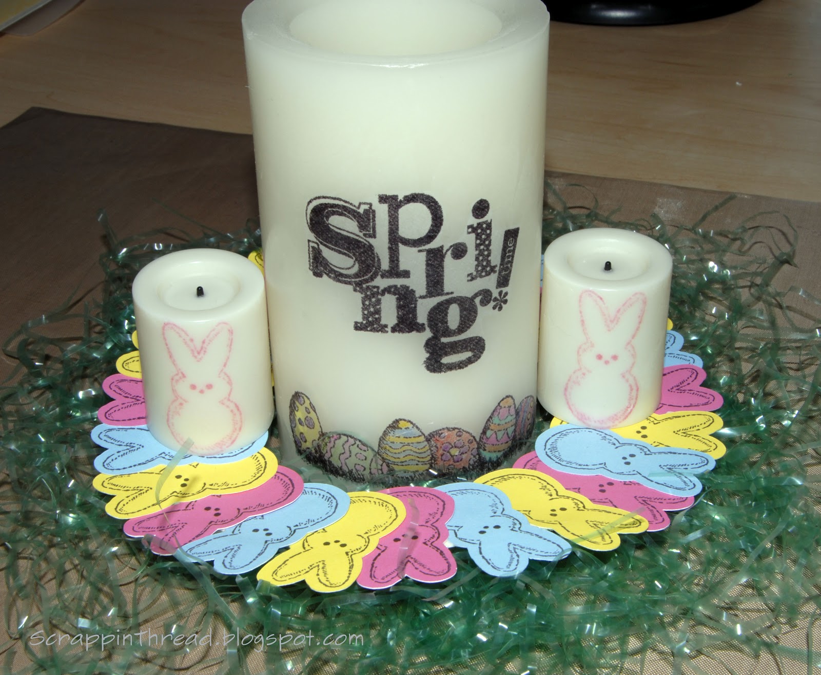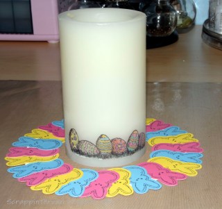 The picture below shows a trial run of the placement to make sure the bunnies would fit properly with the pillar candle I stamped.