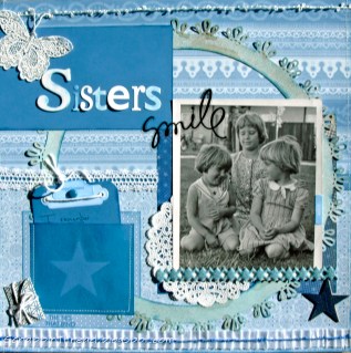 I love your “Sisters LO! I have a bunch of these old photos, too, and I love your idea about not waiting to “fix” them…. just scan to save it and scrap the original. To me, that gives a sense of freedom. I've been putting off doing anything at all with the old originals for fear of more damage. Thanks for the inspiration, again!I haven't been able to watch your “doily” video, yet, but it is already saved in my “Watch Later” list on YouTube! You just work wonders with those punches! I think I'll deem you the Punching Queen!