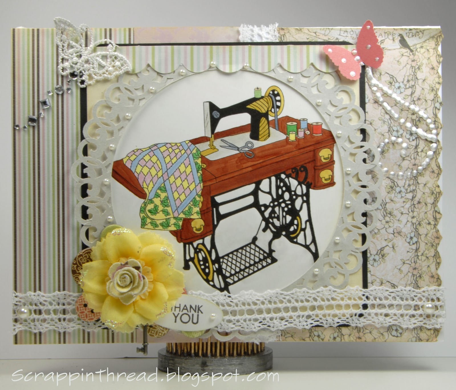 There are a lot of layers in this card!  It is a bold image but I wanted to soften it because of the era of the treadle machines.  I chose soft colors for the quilt and then matched the papers to fit.  It would have been smarter to find papers first and then color, but I got carried away coloring so I forgot my plan!