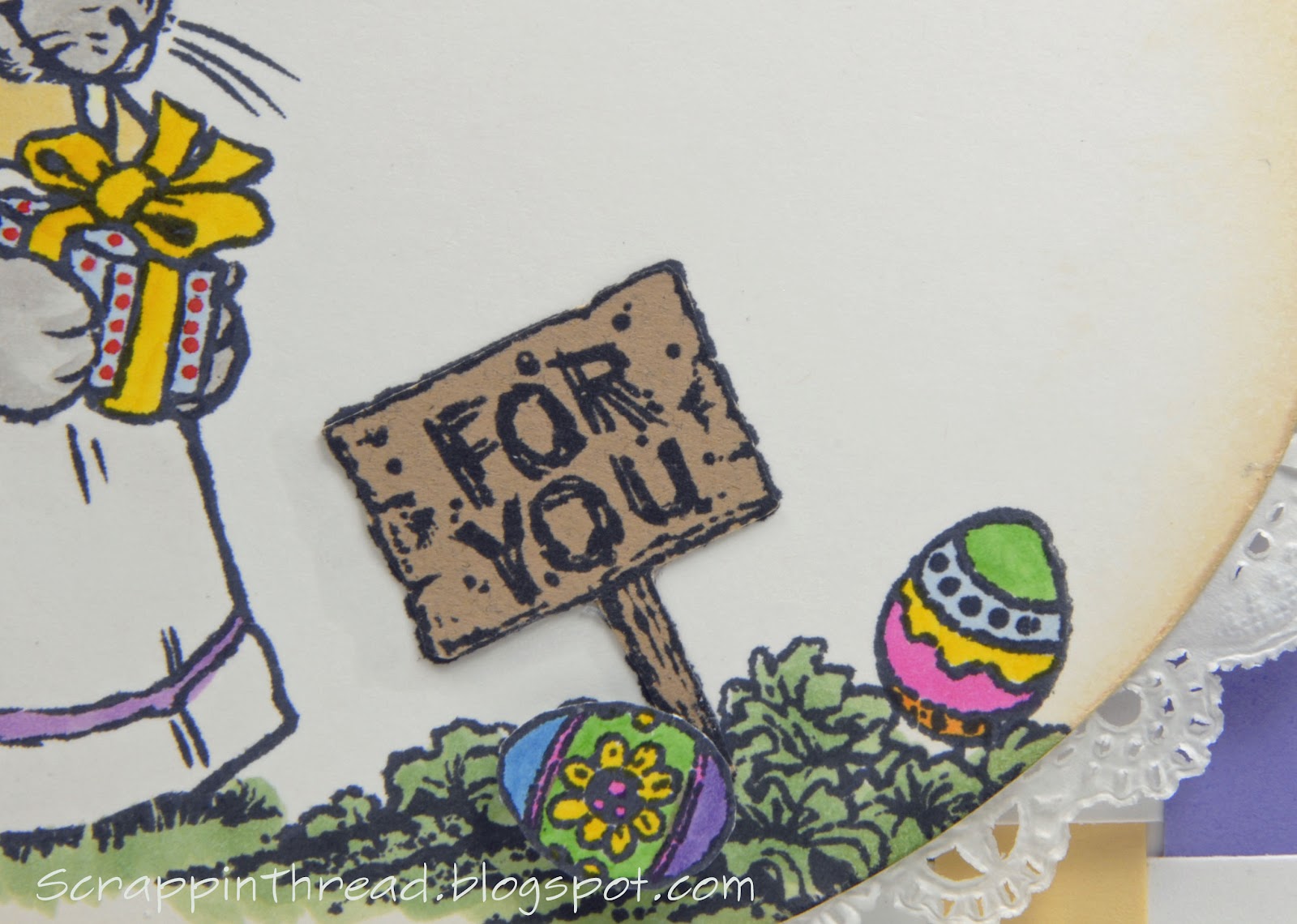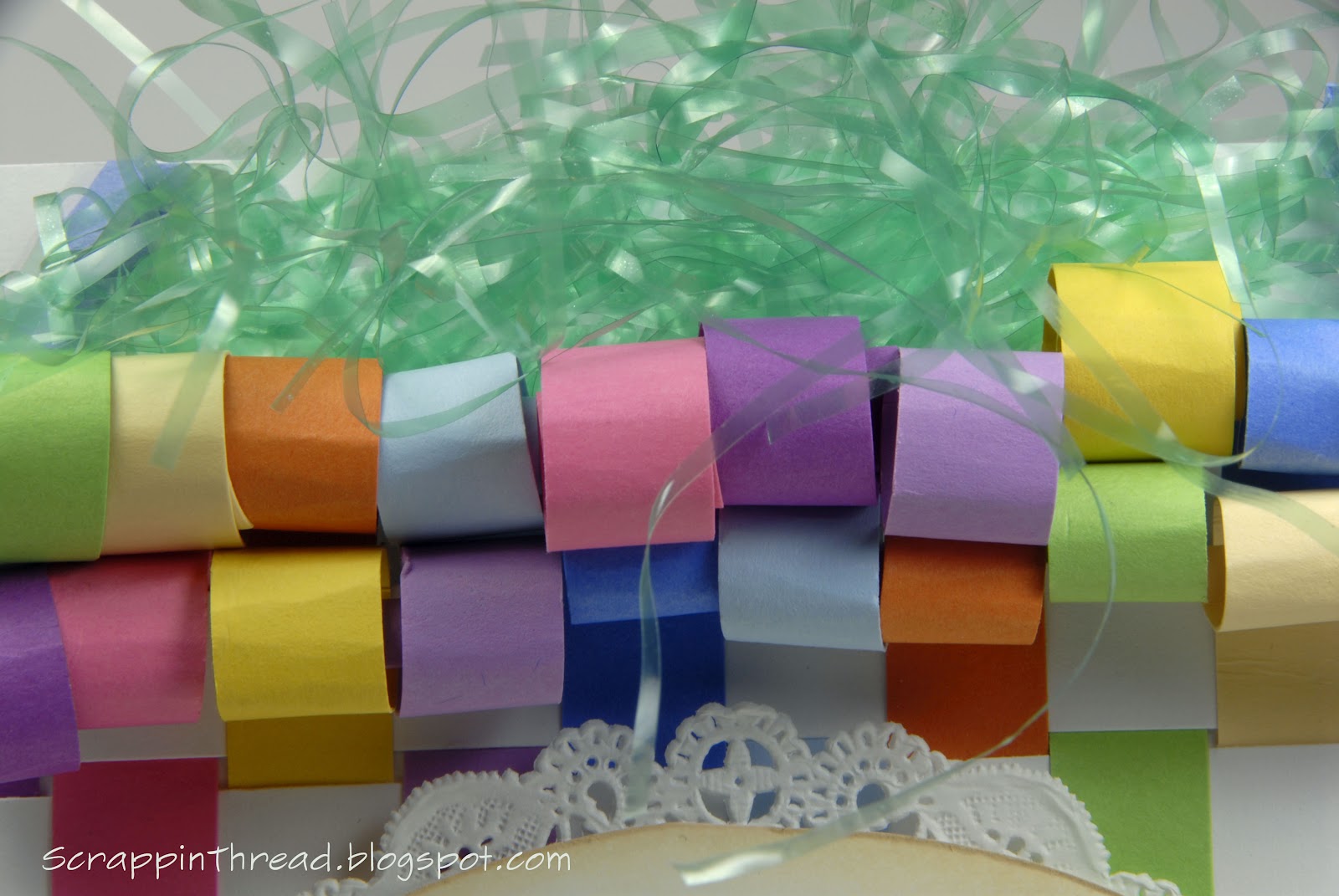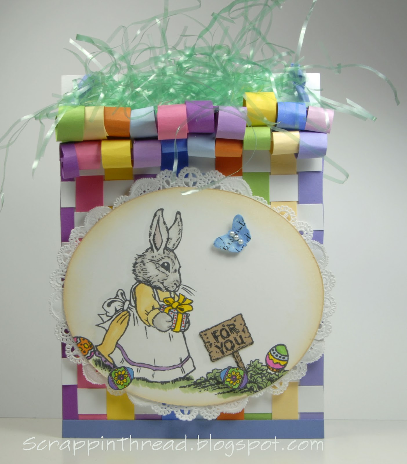 After weaving the paper, I rolled it down to make it look very similar to one of my dd’s previous Easter baskets. The cute stamp images are retired from CTMH. The sign is paper pieced, the rest colored with Copics.