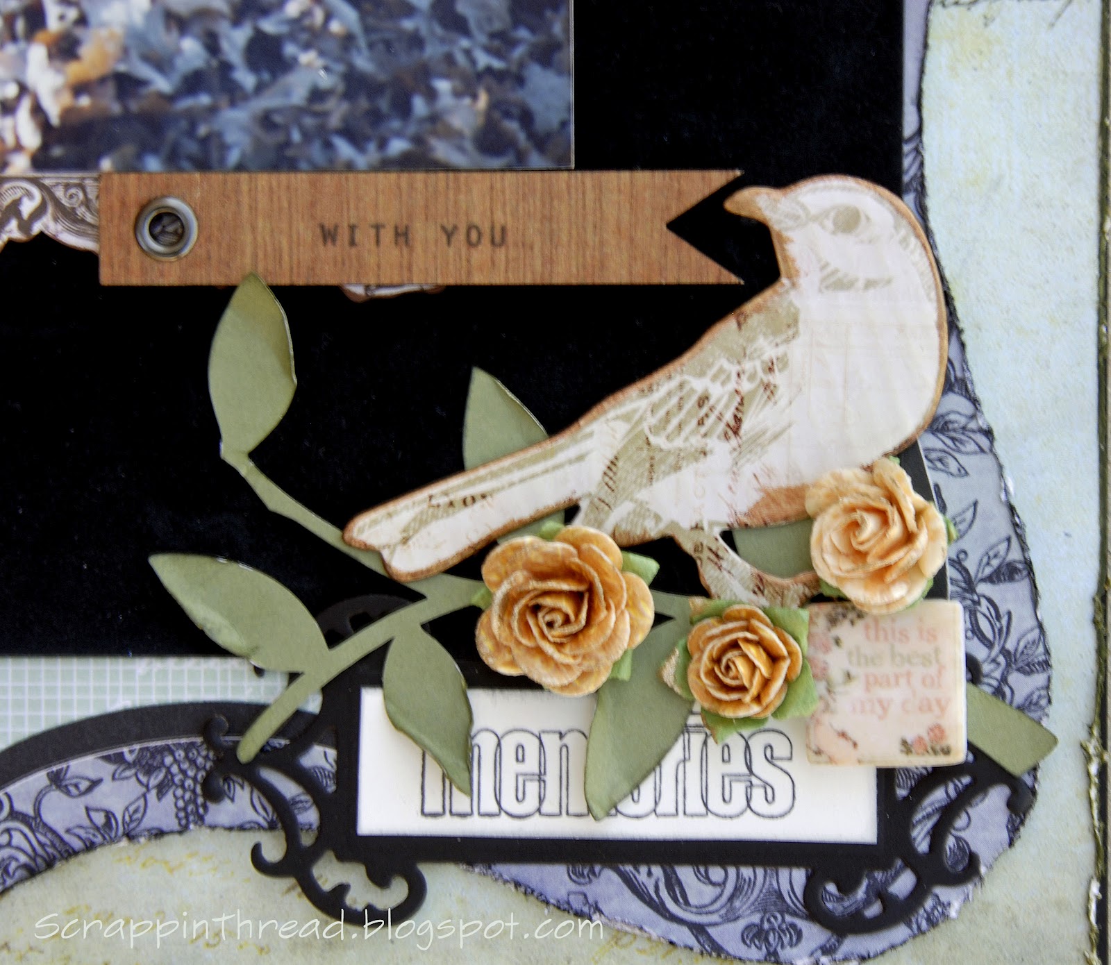 Embellishments: May Arts Ribbon, Prima flowers, chipboard “Remember”, fairy tile, Almanac journaling tag and wood ticket, SU! journaling sticker, Pink Paisley chipboard bird