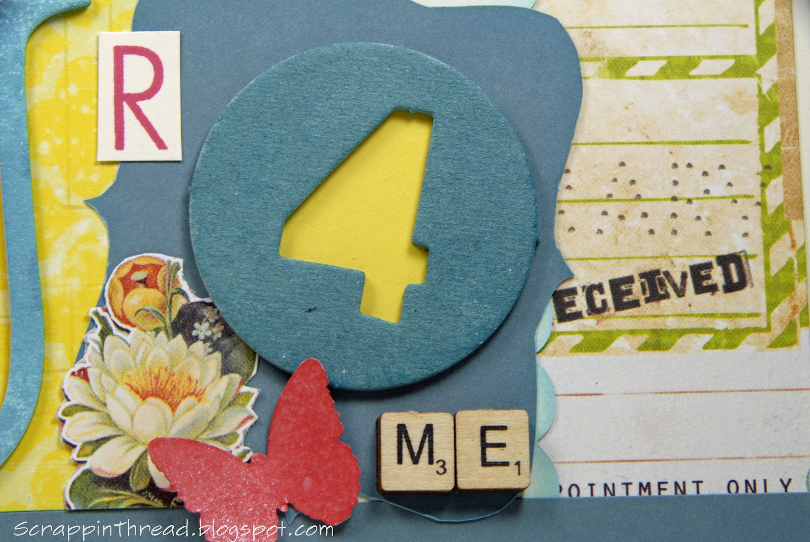 The photo below shows the center of the chipboard piece backed with yellow cardstock and adhered to the tag. I wanted a sort of tone on tone affect with the two blues because the rest of the paper is so busy all around that element.