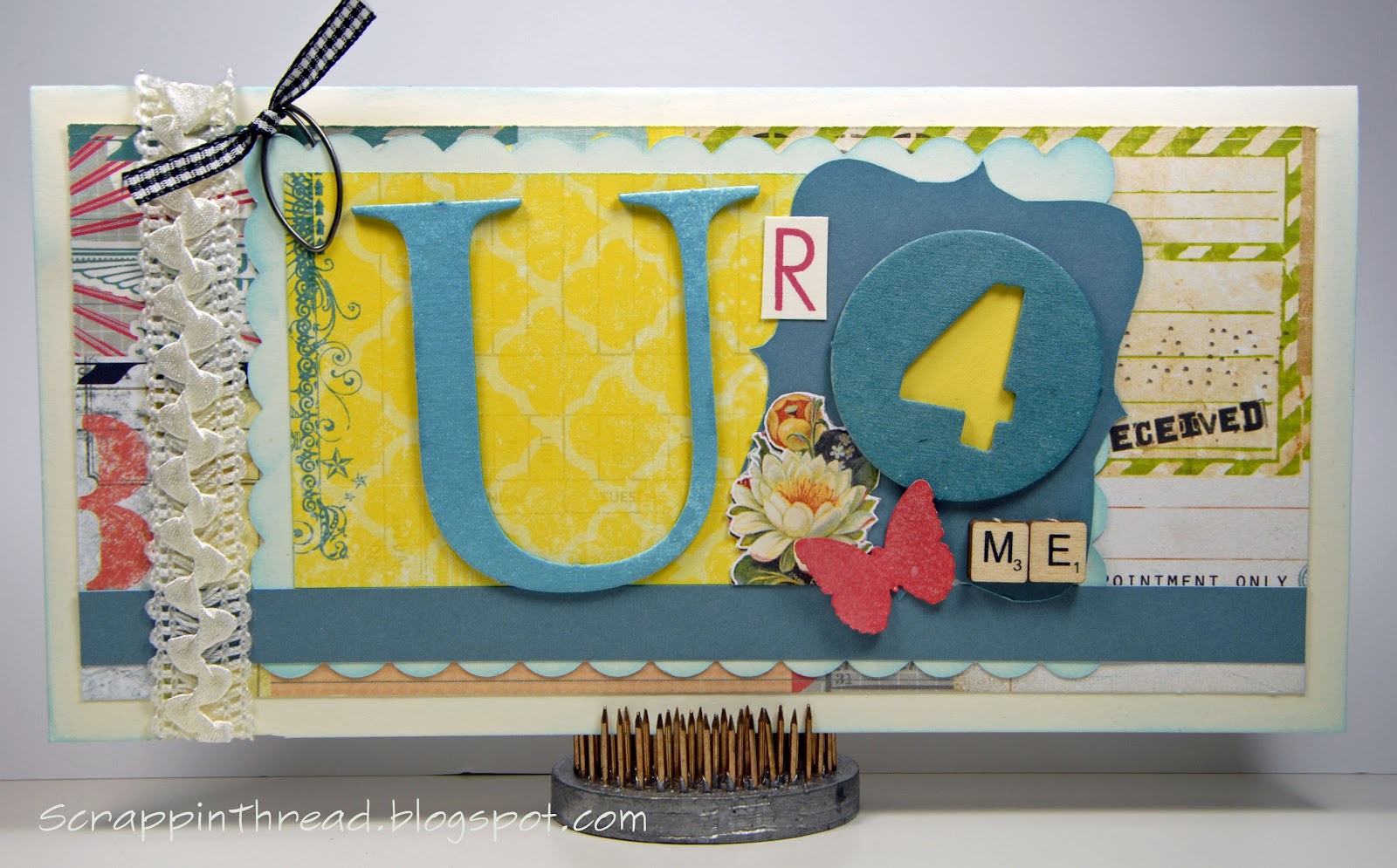 The second card is sort of a kitschy take on the sketch.  The layered pattern papers are from House of 3/Pink Paislee’s Daily Junque line. The CTMH Twilight cardstock tag was cut using the Cricut Art Philosophy.