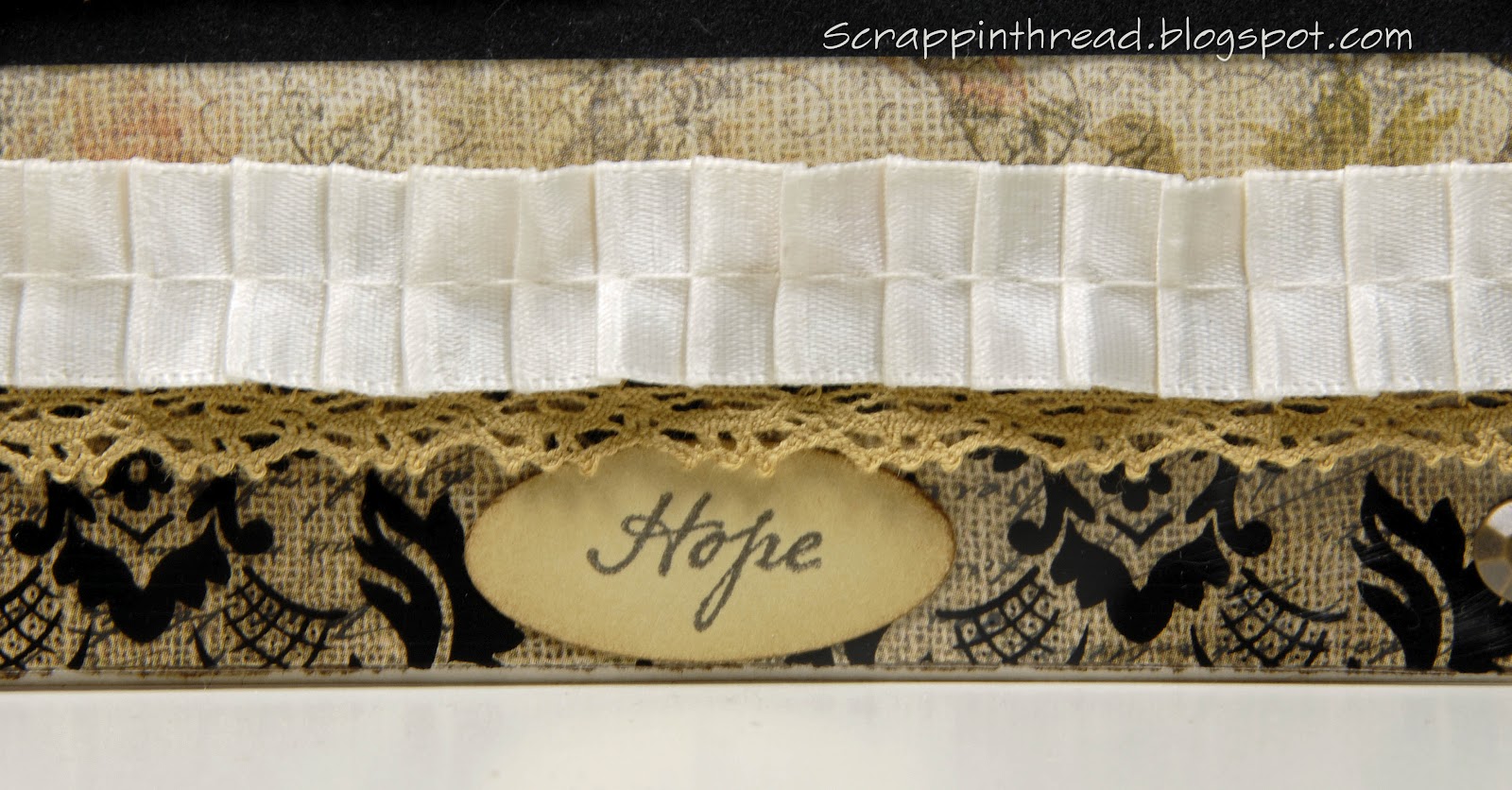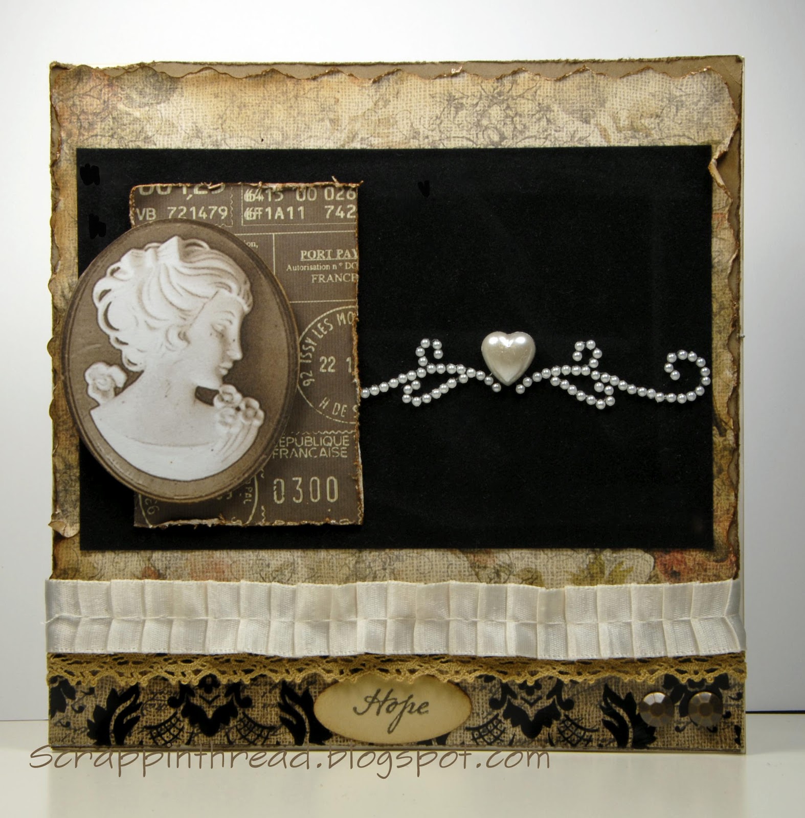 The pleated ivory ribbon is from May Arts. I think by having it under the black velvet paper it keeps the focal point on the cameo. The pearl and heart flourish from Zva adds another nice vintage touch.