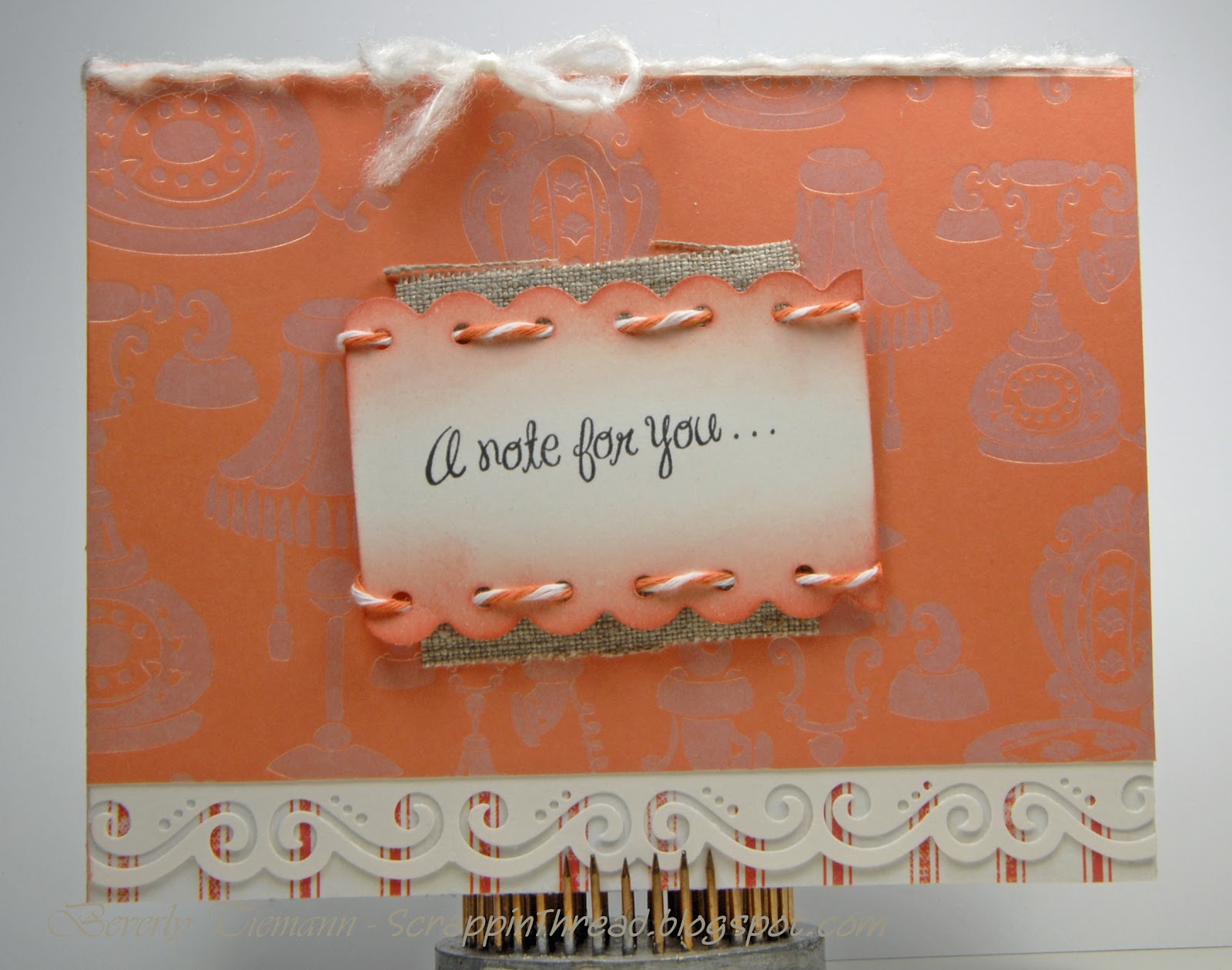 I love the embossed telephone/chair paper in this stack from SEI. The striped paper came from the same pad. It is from the Promise Me collection.