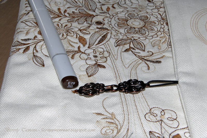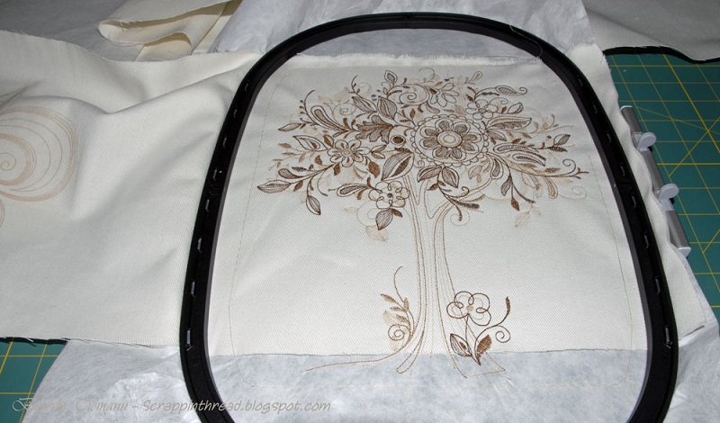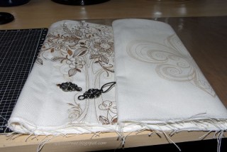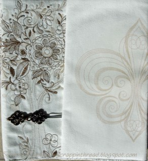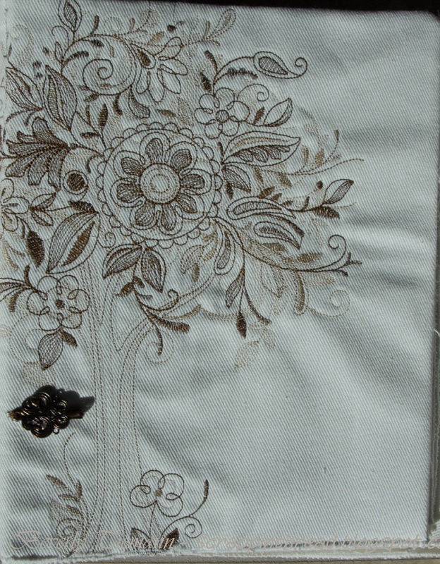 The back cover wraps around the front and stays closed with a clasp purchased in the button department at Joanns. The embroidery designs are from OESD’s Sepia Petals. The stabilizer is large enough to be completely hooped, the fabric is hooped on the sides.