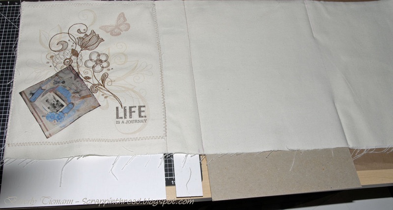Once all the pieces of the chipboard were in place, I serged the bottom of the book. I worked on the inside cover prior to assembling the other pages. Because it was to be embroidered, it was easier to do it this way. The interior of this art journal is still a work in progress and not quite done yet.