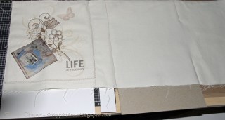 After embroidering the outside cover, I sewed the inside cover to the front on three sides. The clasp was sewn to the back (wrap-around) cover using elastic sewn into the seam. Initially, I serged the three sides, thinking that I was going to do a raw/serged outer seam. As I continued working on it, I decided to sew rights sides together and turn it out. I knew the bottom edge would be serged once the chipboard pieces were in place. The somewhat rough edge that the serging makes is the look I wanted for the bottom. All of the pages of the book are also serged around the edges.