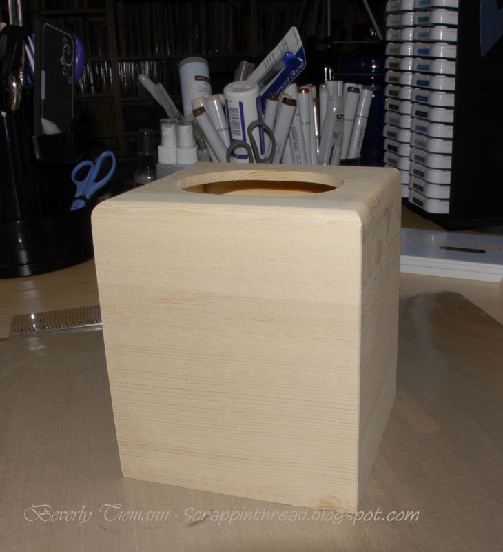 I covered the exterior of the box with gesso and then painted the top with a cream color acrylic paint. The box is about 5″ wide and 6″ tall and fits a standard Kleenex box. After measuring and cutting each of the side pieced I Mod Podged them in place.