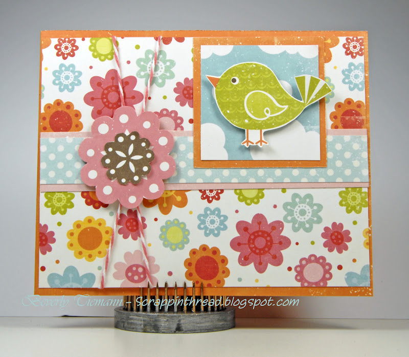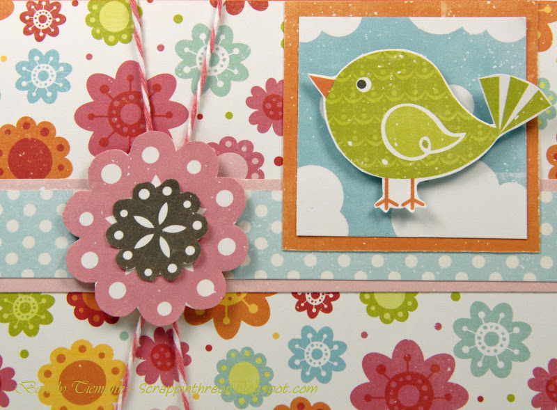 For this card, I flipped the sketch.  It is a standard size card and can be easily mailed.  The bird and large flower are raised a little bit with foam dots.  I love how the baker’s twine from CTMH matches this paper perfectly.