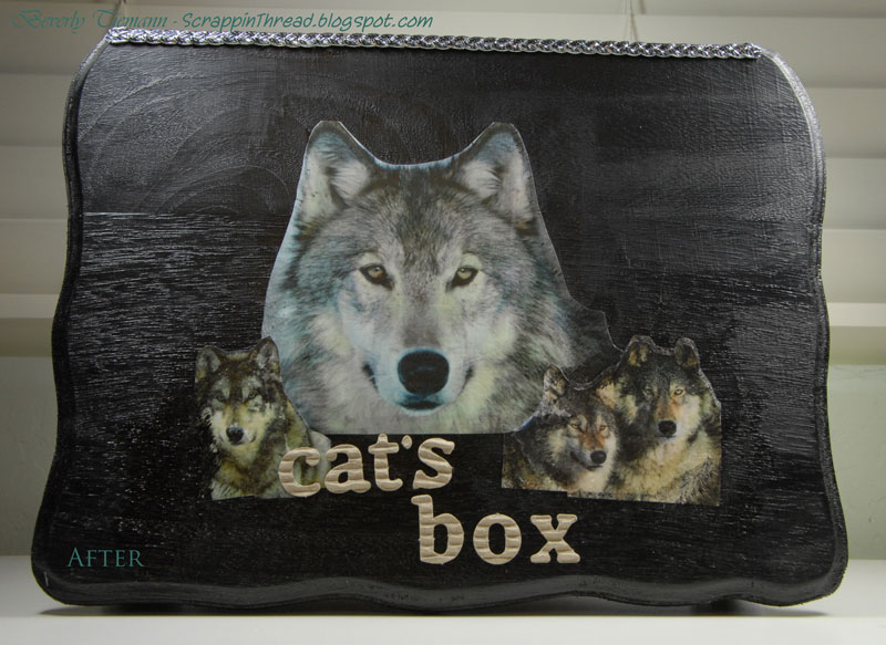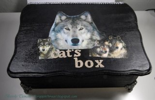 His initials are CAT. My weird sense of humor thinks it is a bit funny to have a cat box, especially with pictures of wolves. Dh loves me anyway, so it is ok that I am odd like that.