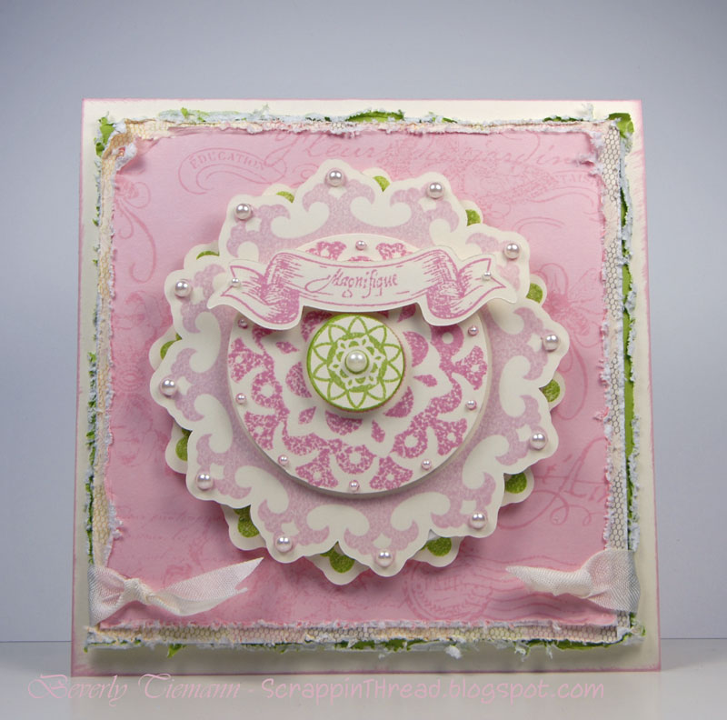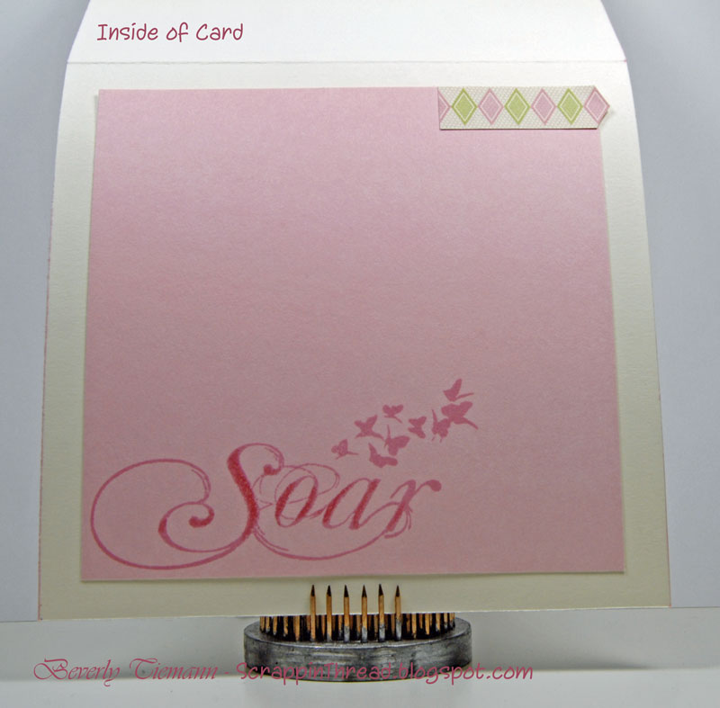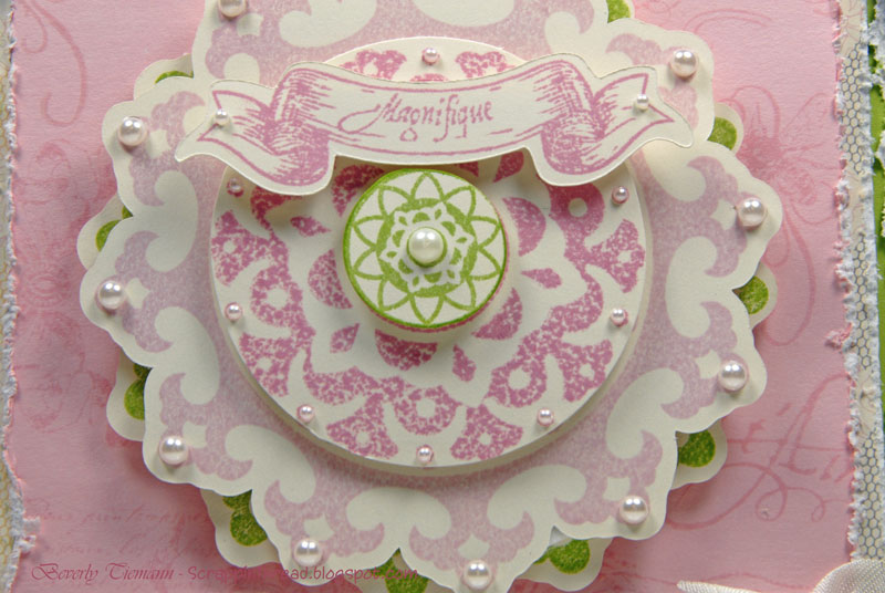 I used 6 of the 7 of the new Jardin stamps to create the background on the Baby Pink cardstock which is under the layered medallion in the center.  This was placed on top of a square from the soon-to-be-retired Lucy B & T paper. Which in turn was placed on a piece of Pear cardstock.  All of these squares were edge distressed.  The card base is Colonial White card stock cut 5 1/2″ by 11″ and folded in half to make a square.