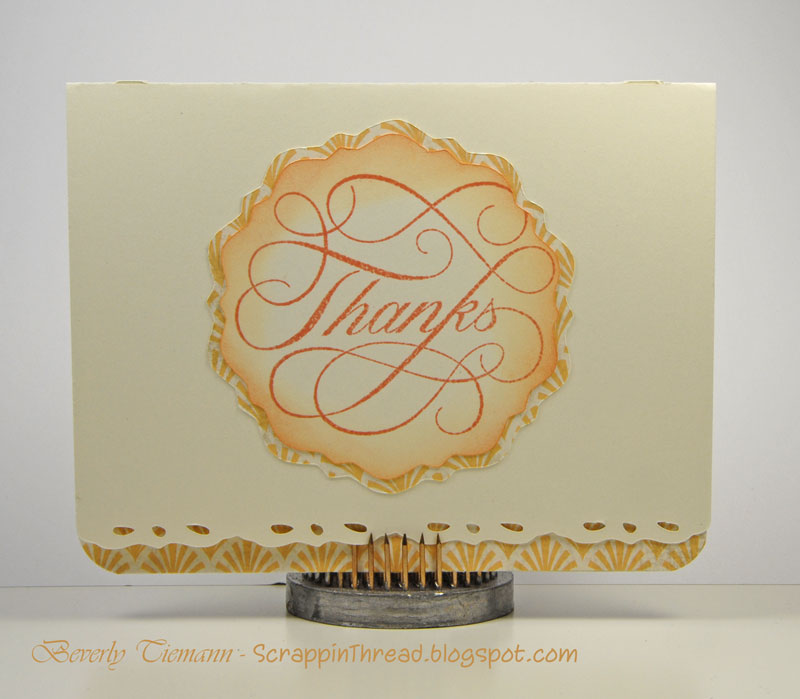 The Thanks sentiment was stamped onto Colonial White cardstock that had been cut using the Accent 4 shape on page 35. I cut it at 3″ and then cut it again at 3 1/4″ on the patterned paper to layer it. Sunset ink was used on a sponge around the edge of the Colonial White after stamping the image.